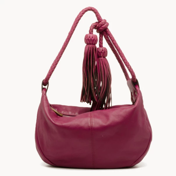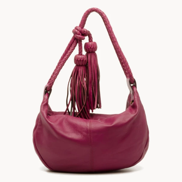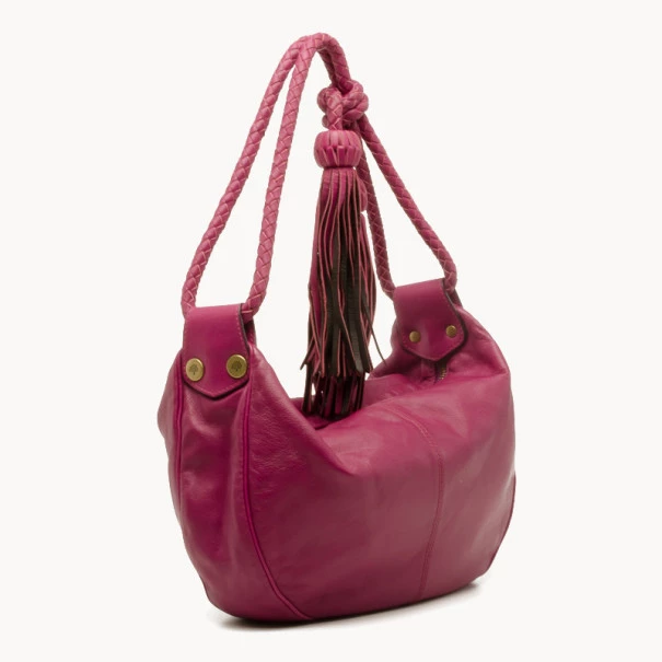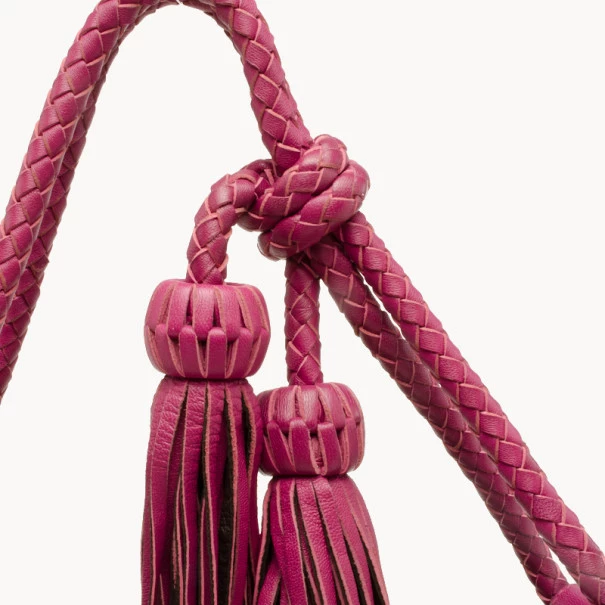 Add a lovely pop out color to your outfit with this charming pink shoulder bag by Mulberry. Made from smooth Nappa leather, this handbag features braided shoulder straps with large decorative tassels, contrast stitching and gold tone hardware. The interior is lined with fine woven canvas.Seen on: Kate Middleton