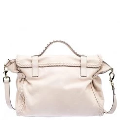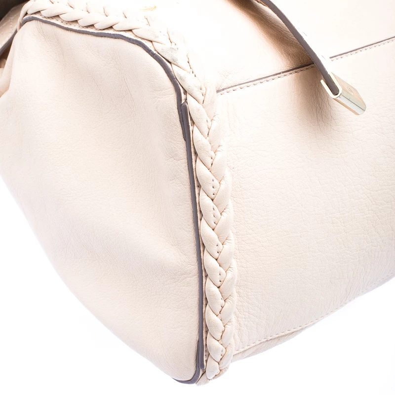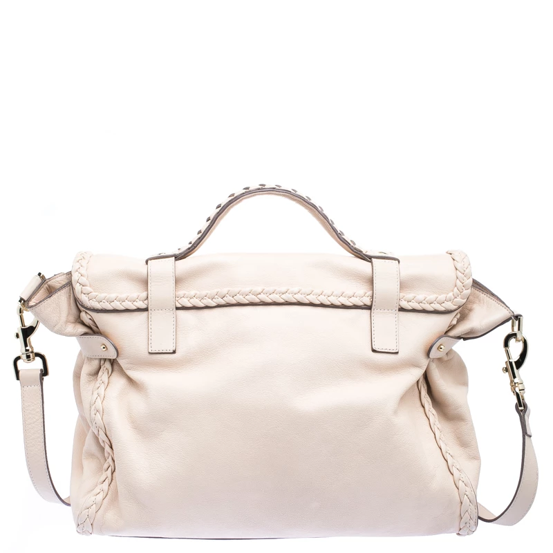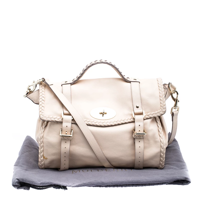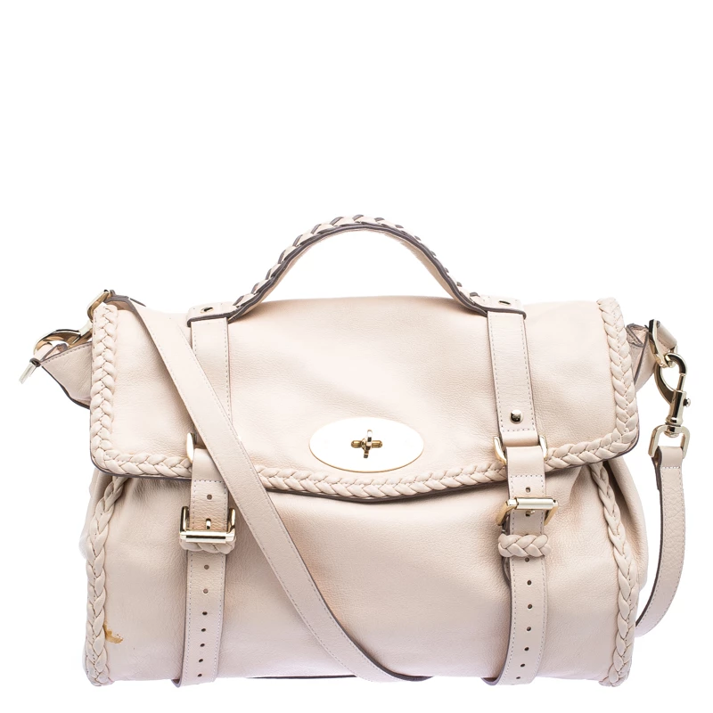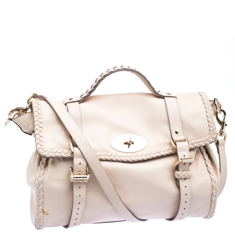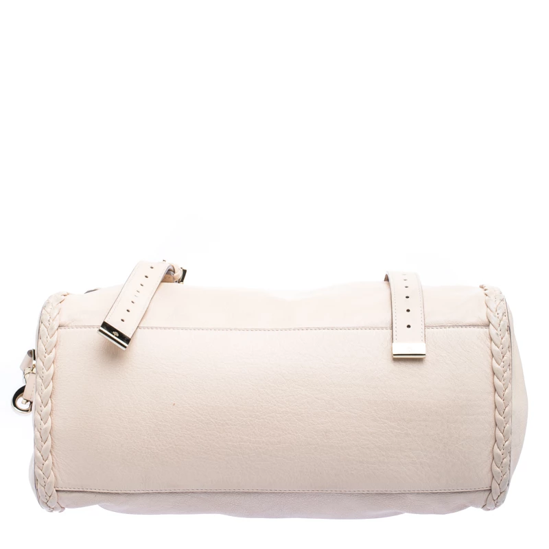 A convenient, fuss-free bag for travel or weekend, this Alexa satchel from Mulberry features an oversized silhouette. It is designed in a classic beige leather and detailed with braided leather trims. Secured with a twist lock closure, this bag comes with two rolled top handles and a detachable shoulder strap. Store in all your travel essentials in this chic bag.
