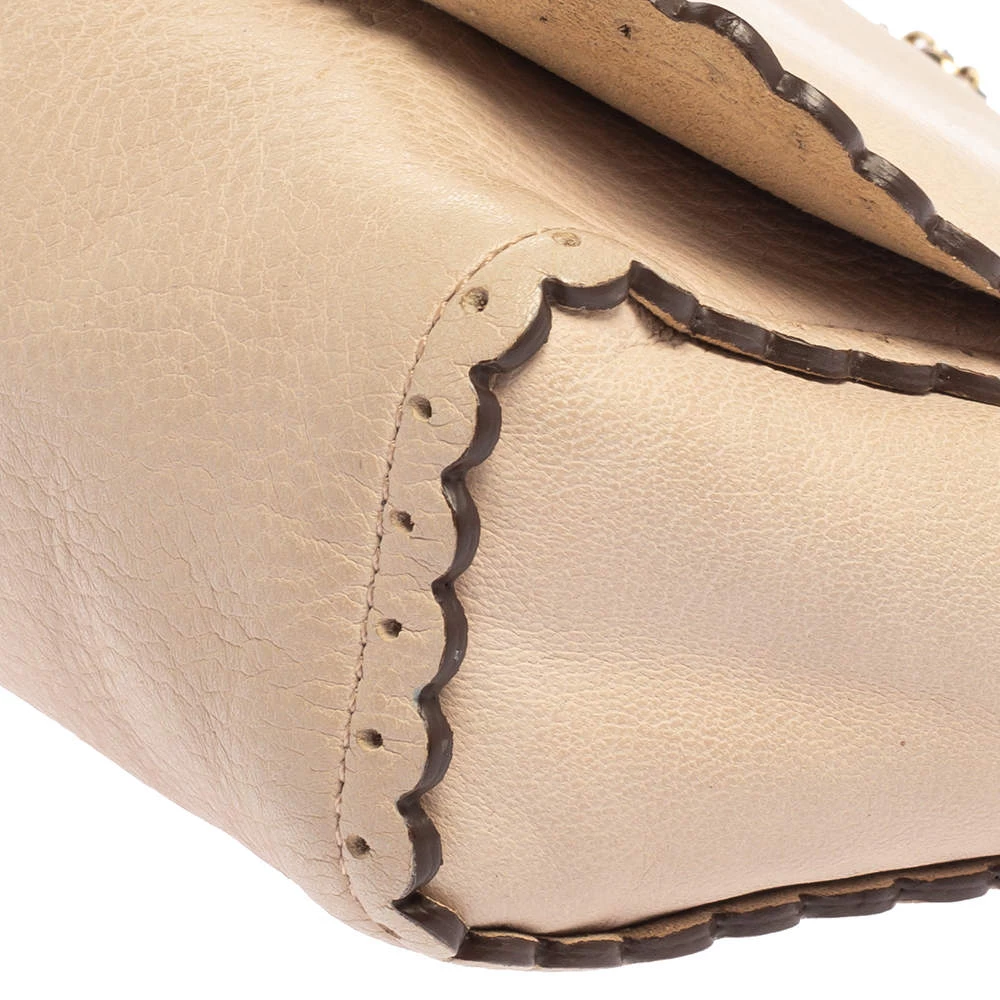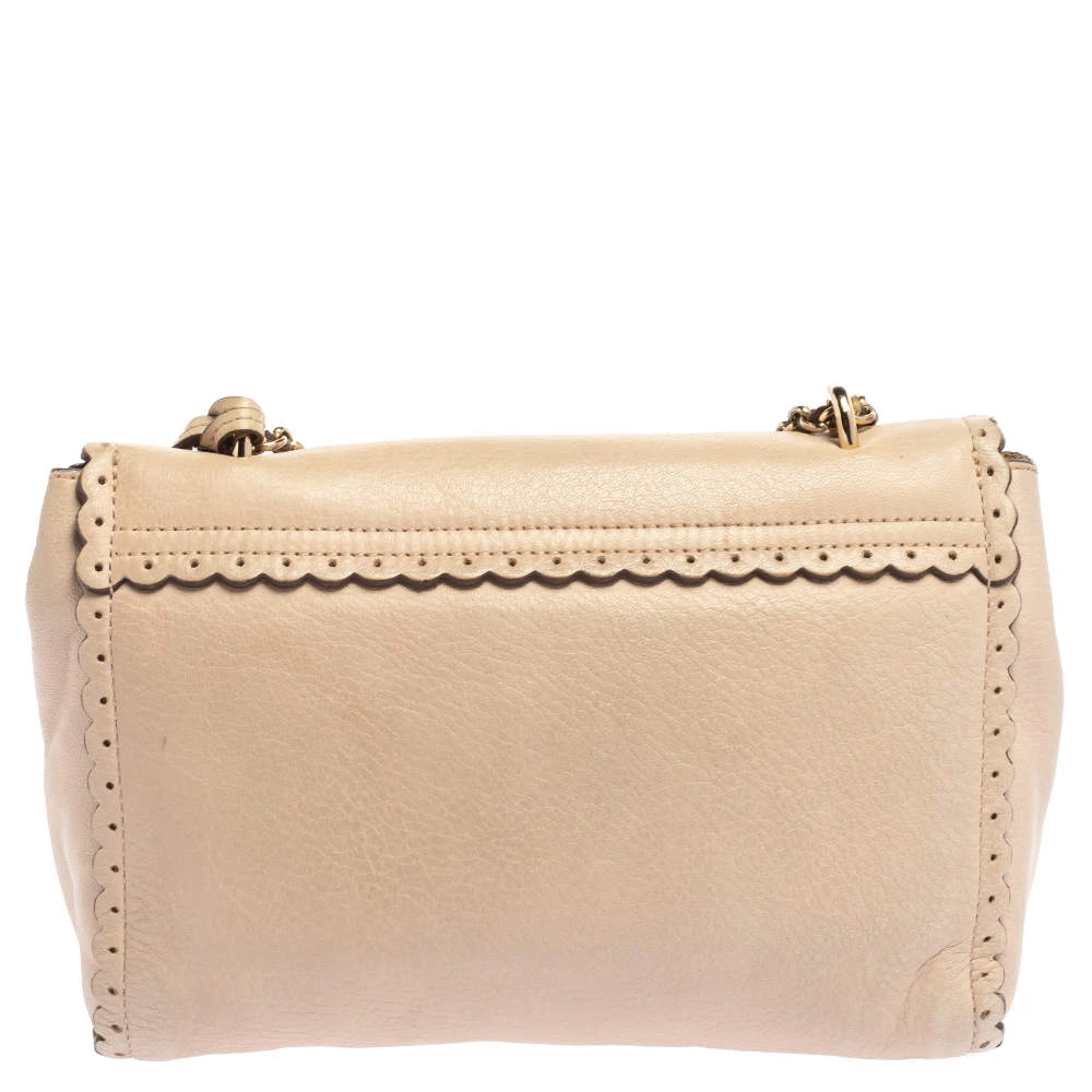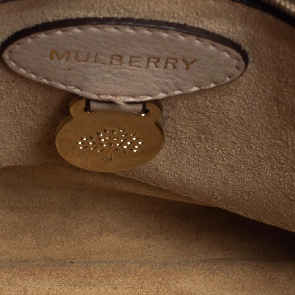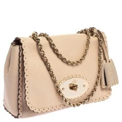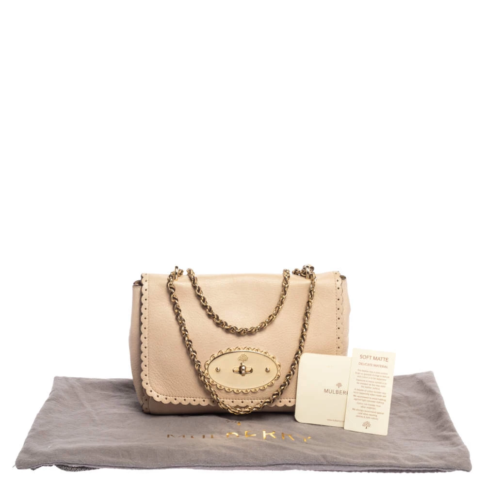 This Mulberry Lily bag is lovely. Crafted from leather, the beige bag comes with a chain and leather woven strap, a postman’s lock on the flap, and a spacious interior. It is ideal for everyday use.