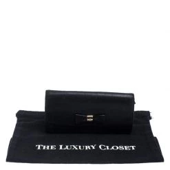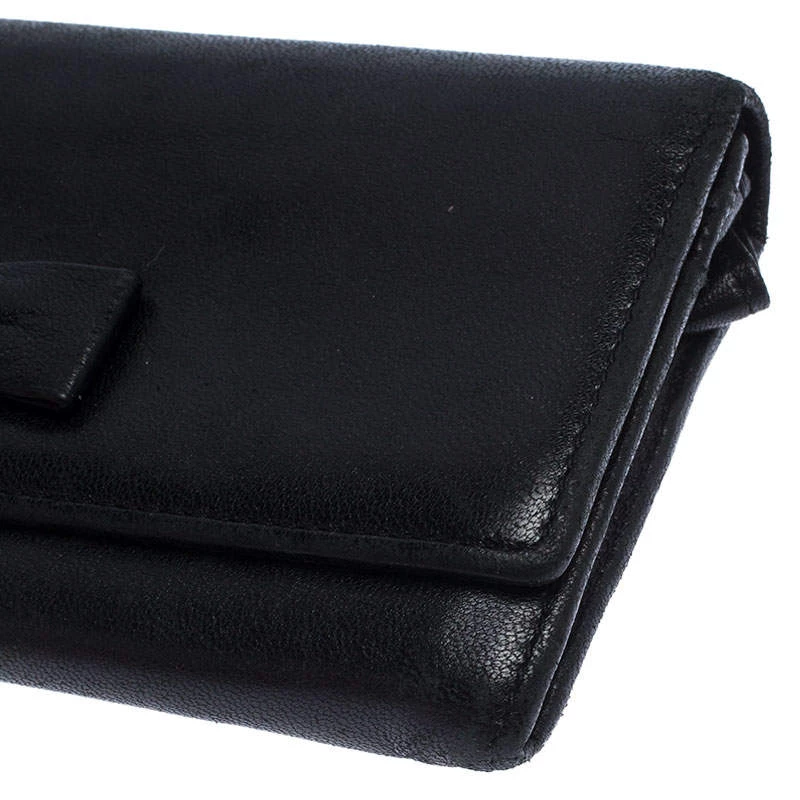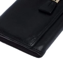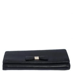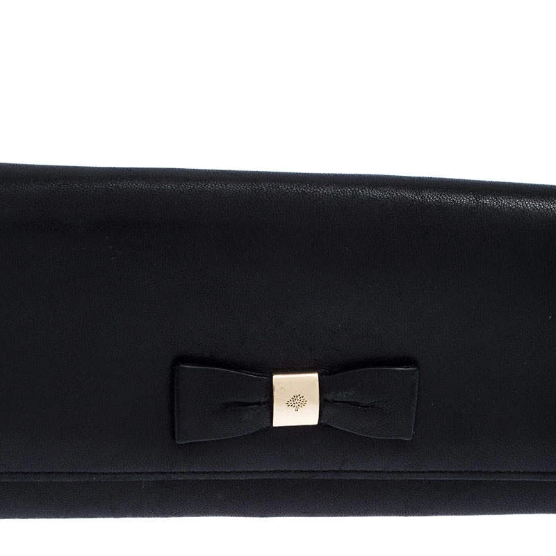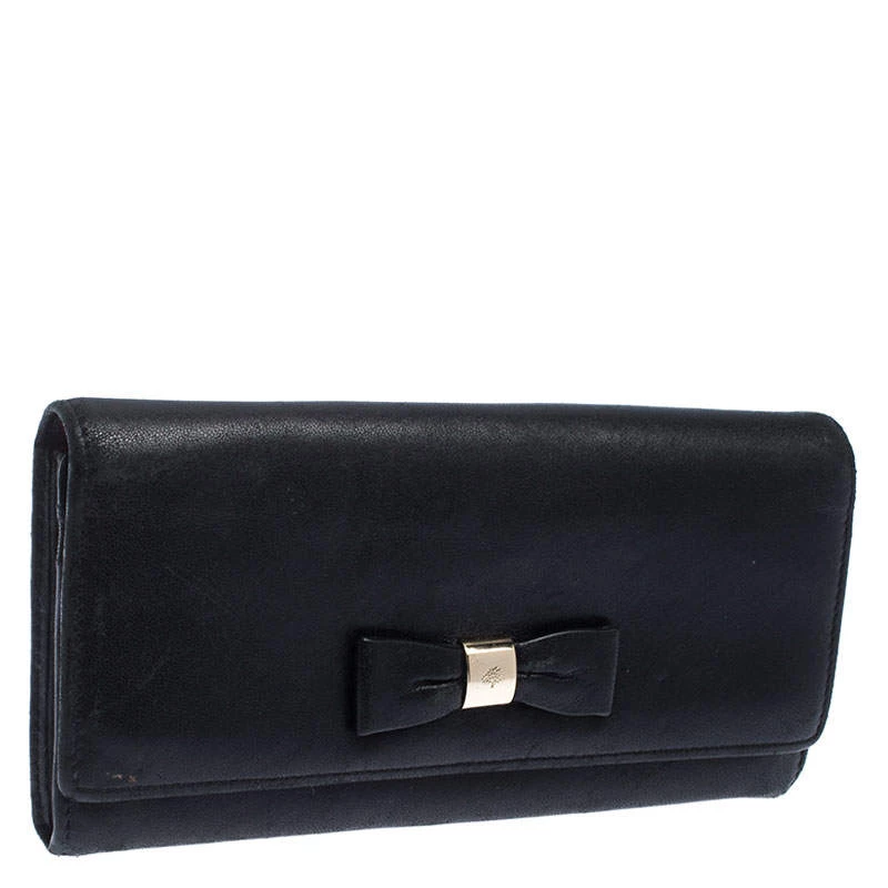 This stunning wallet by Mulberry has been crafted from black leather. It features a bow on the closure that opens to a leather interior equipped with zip compartments, multiple card slots and open compartments. It has been expertly crafted to design functionality and is the perfect home for all your essentials.