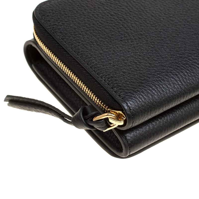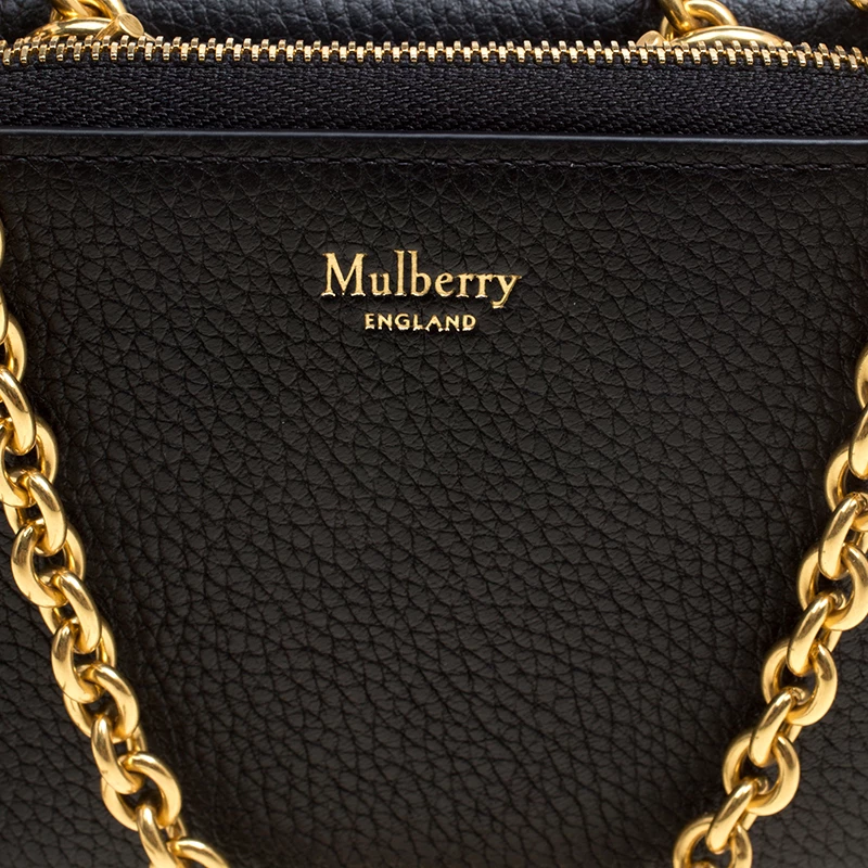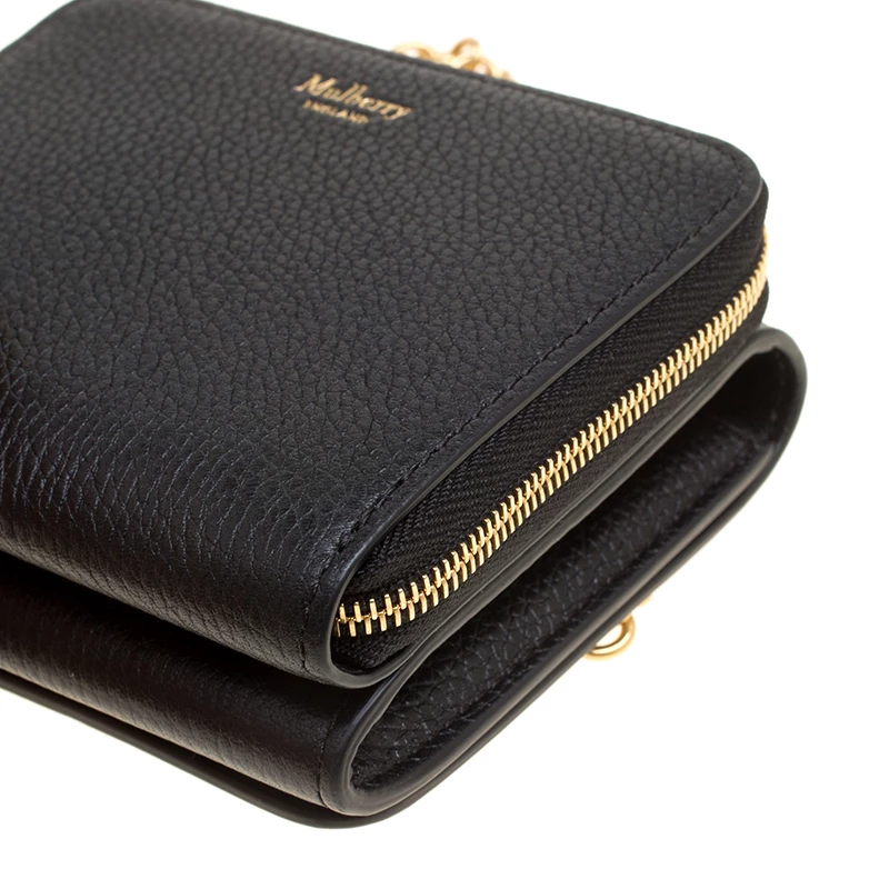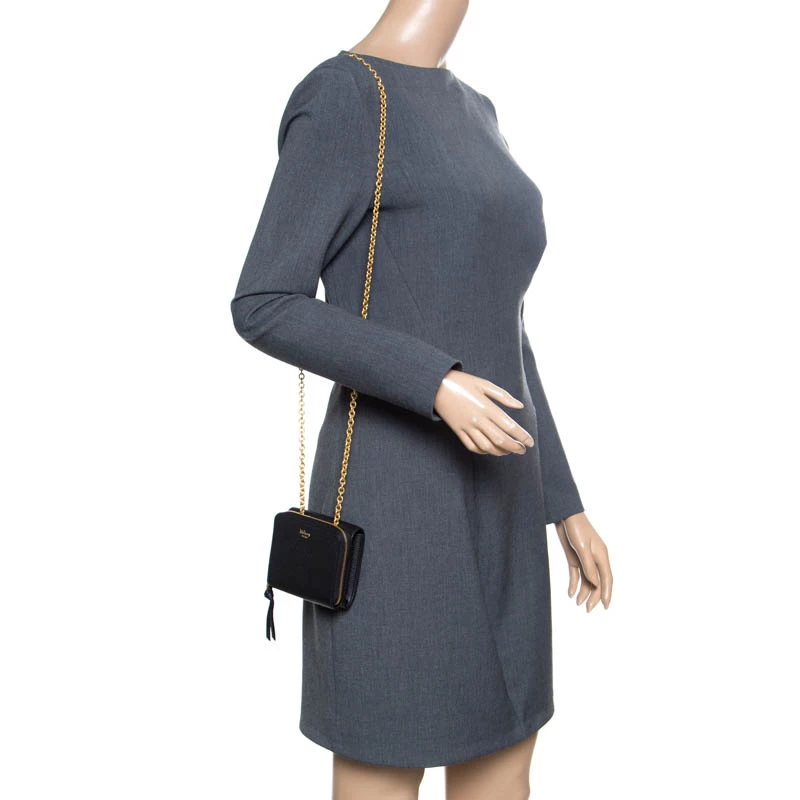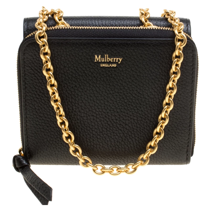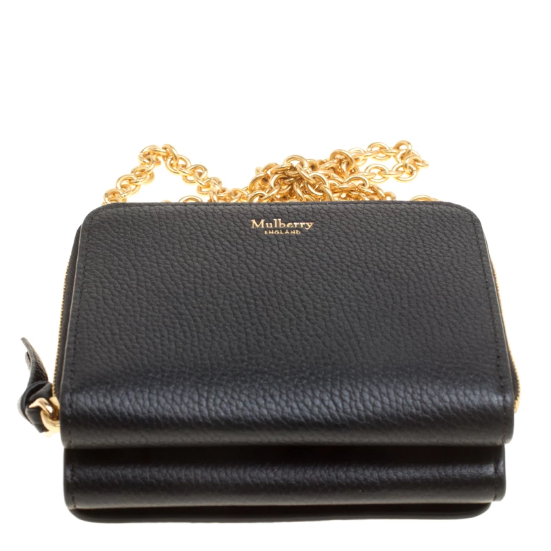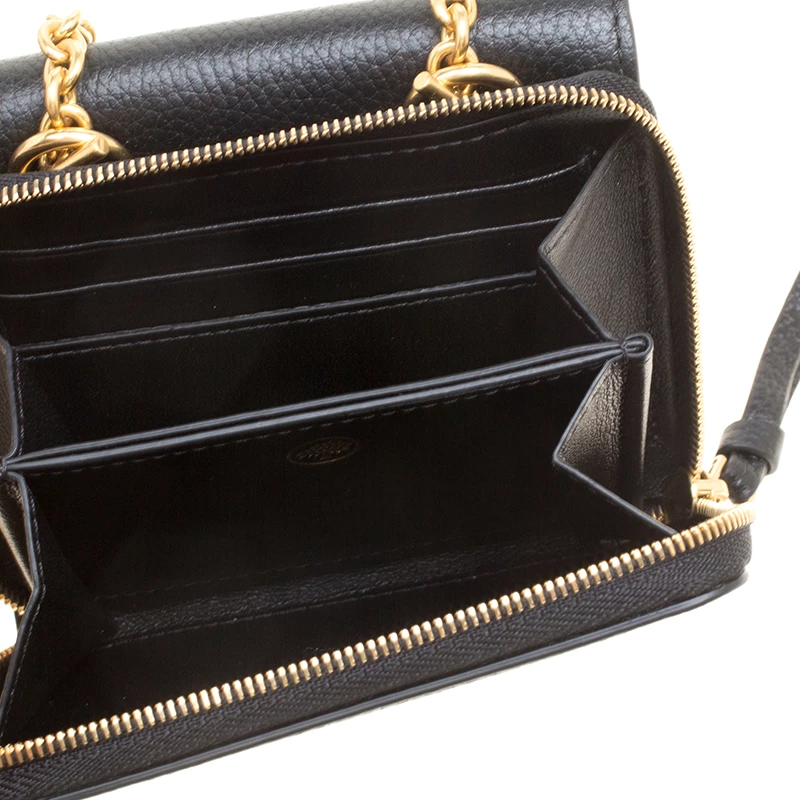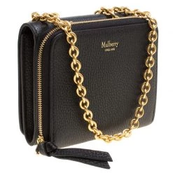 This gorgeous accessory from Mulberry has been crafted from black leather and has a well-sized interior with multiple card slots and open compartments. The lovely creation is complete with a chain sling, back pocket and the brand logo on the front.