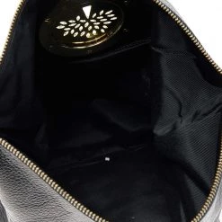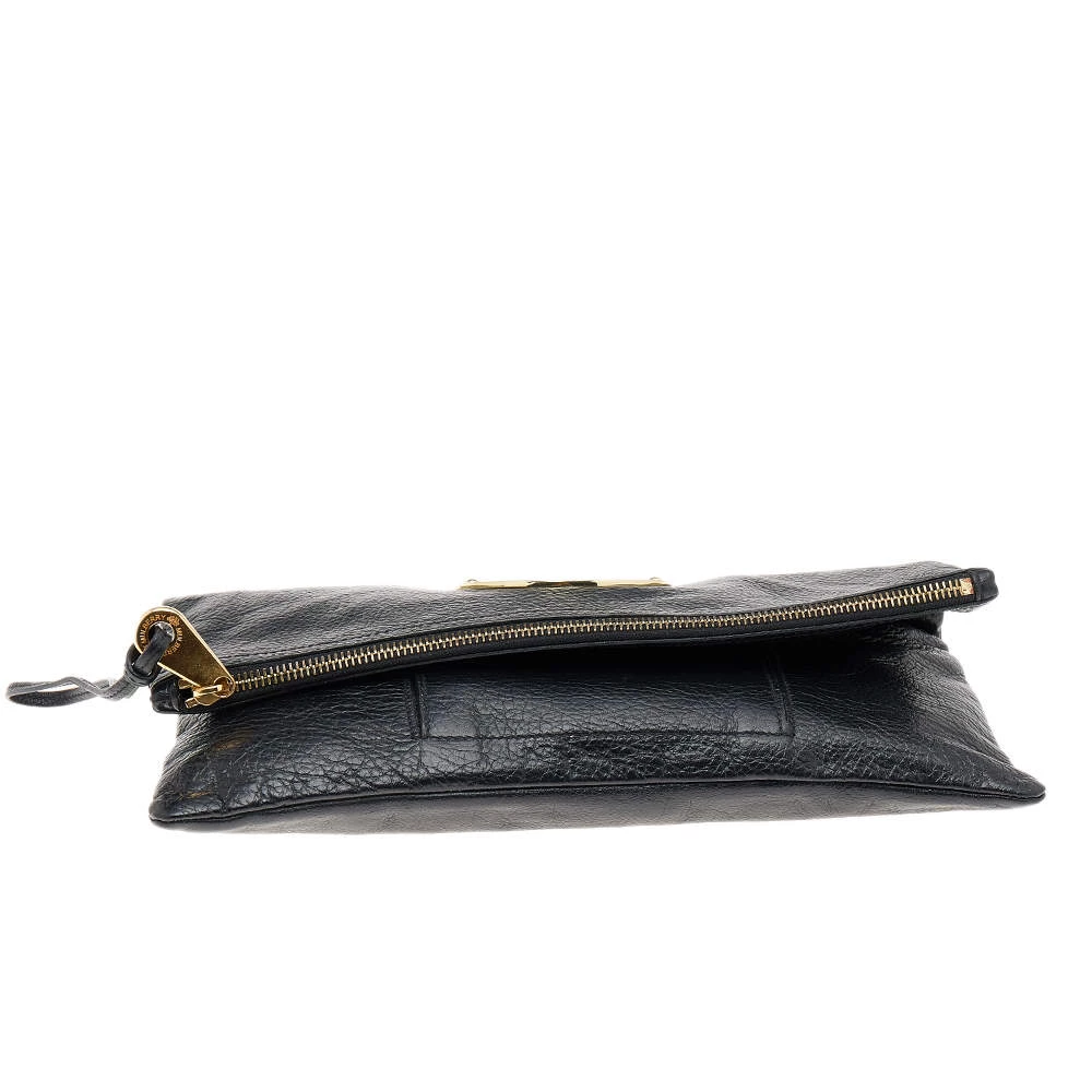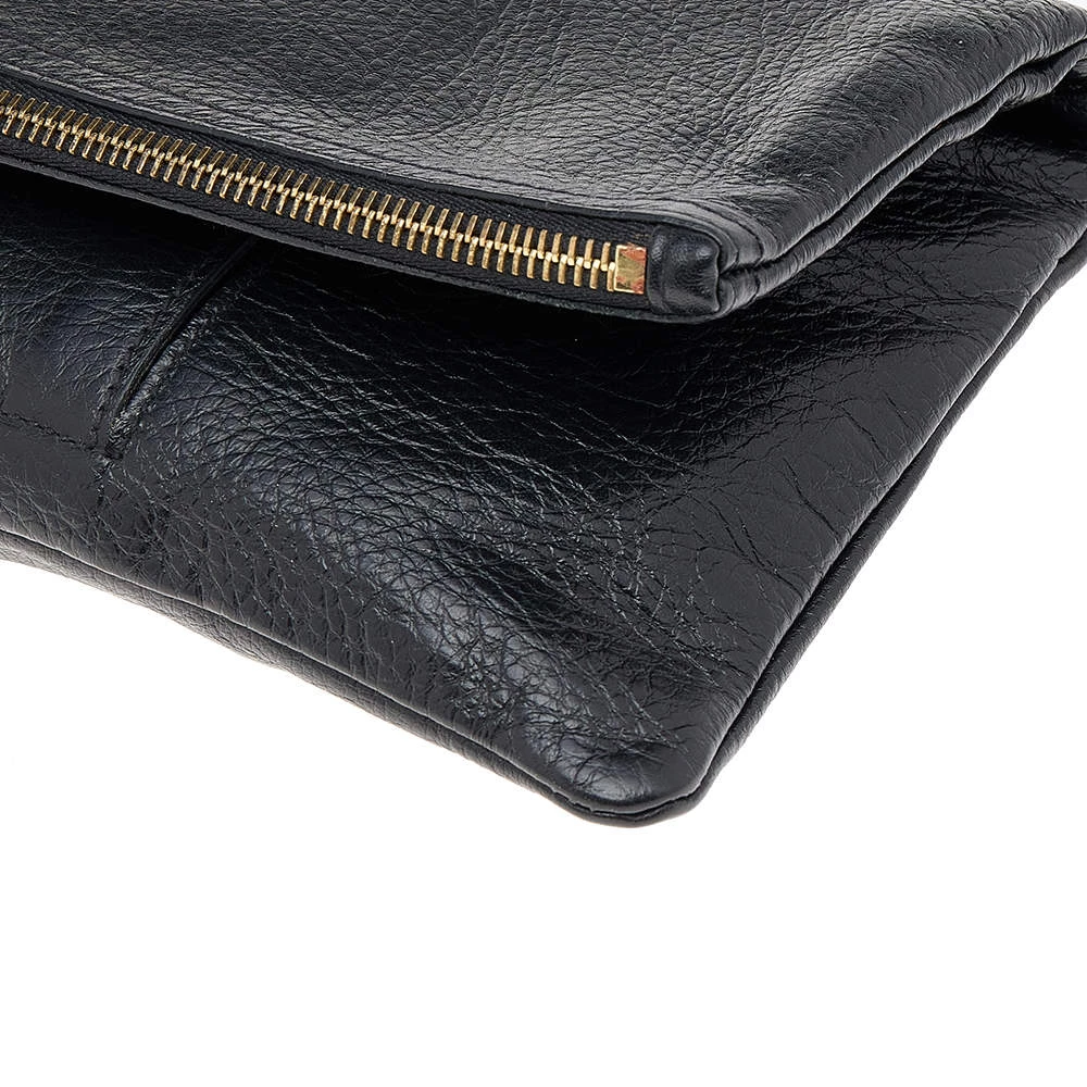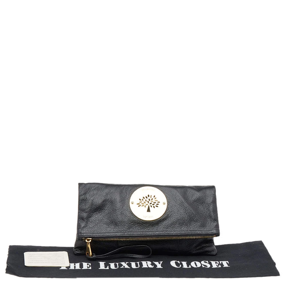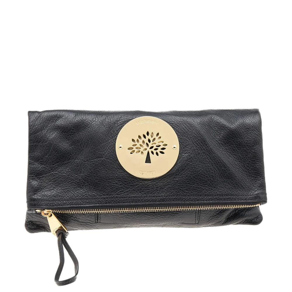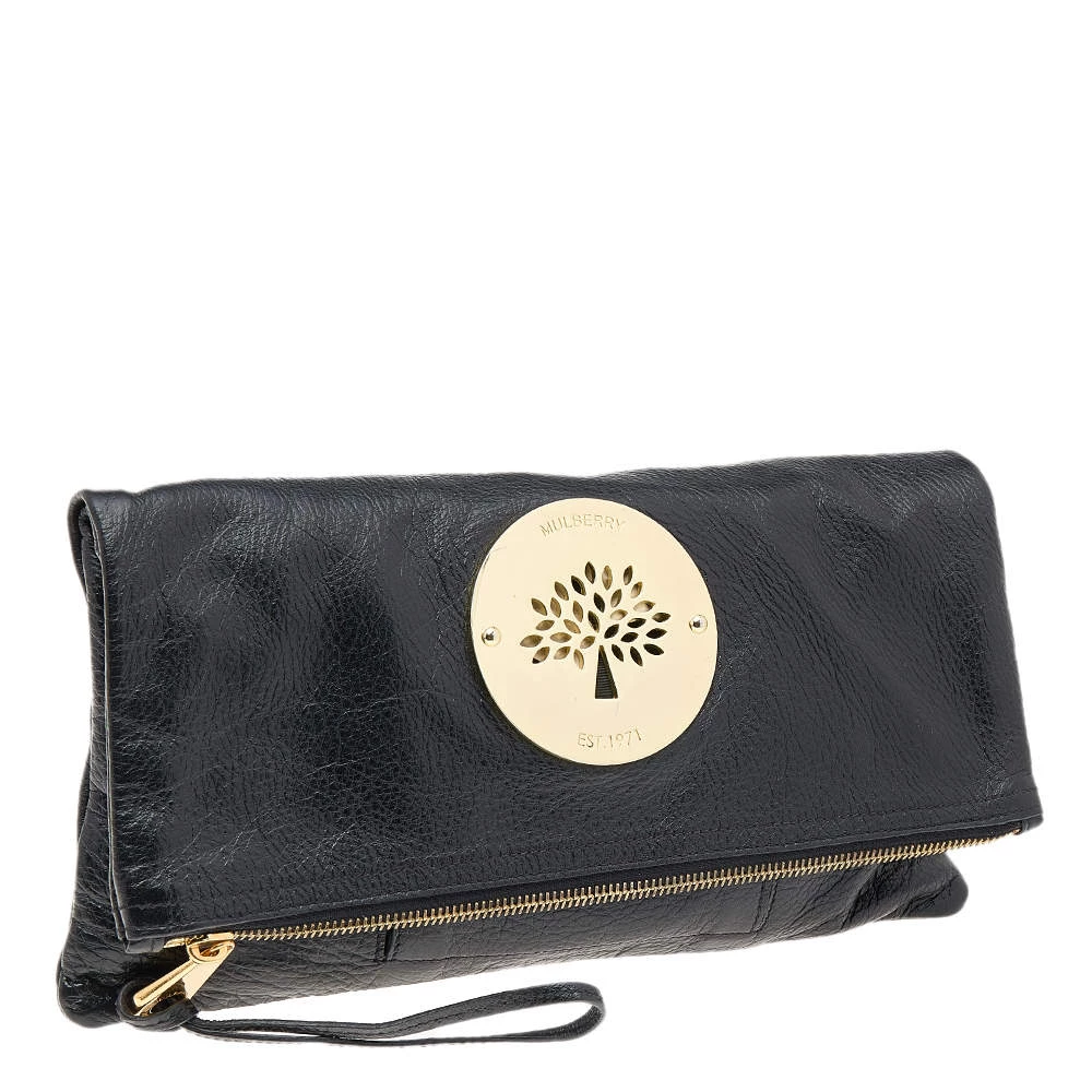 Mulberry brings you this gorgeous clutch that has been crafted from leather and styled as a fold-over. It carries a black shade with a well-sized fabric interior and the brand logo on the front. The clutch is complete with a wrist strap.