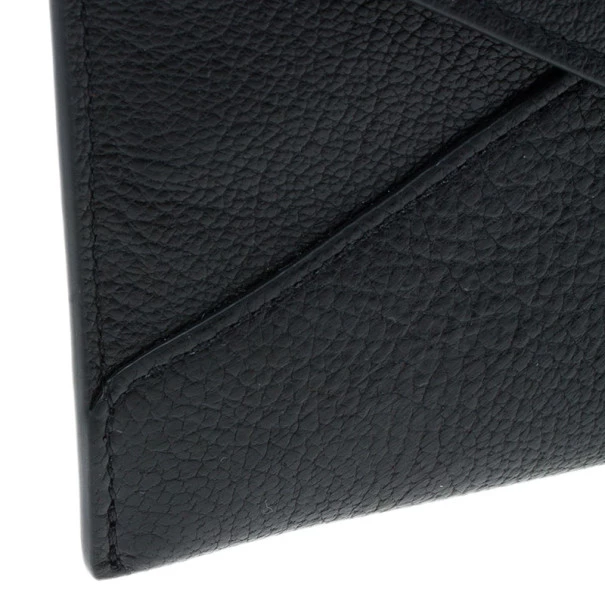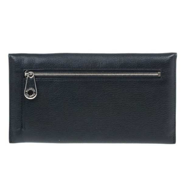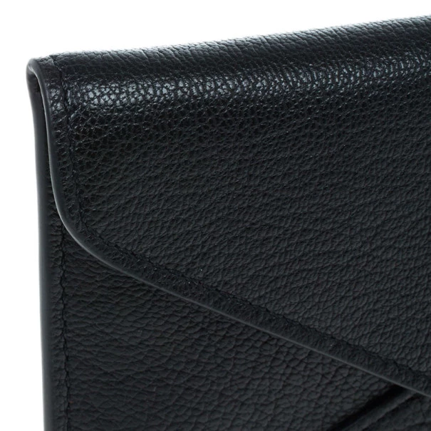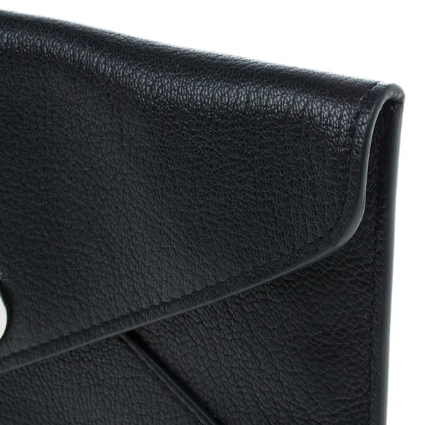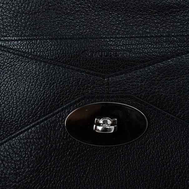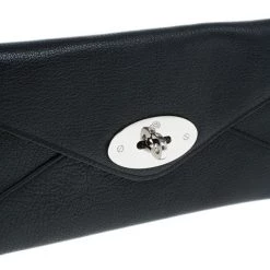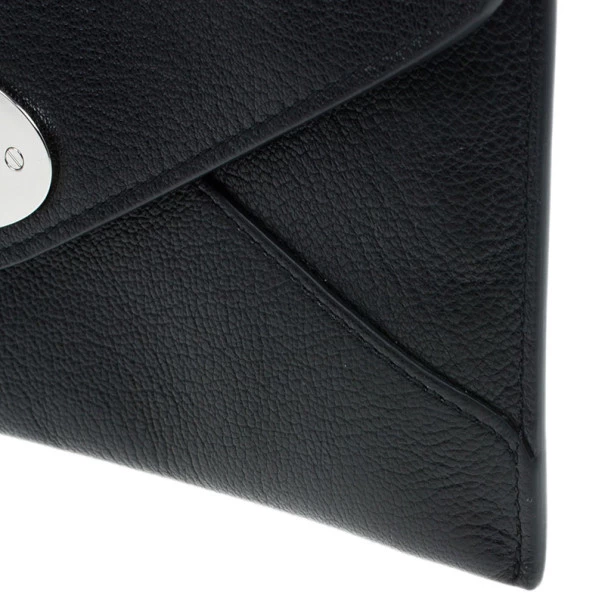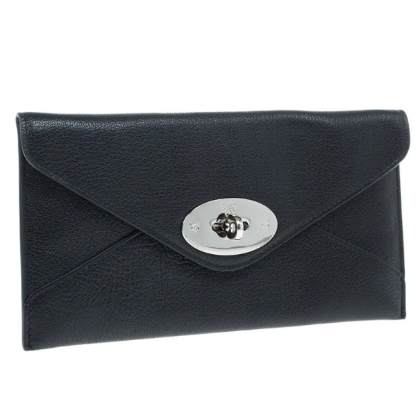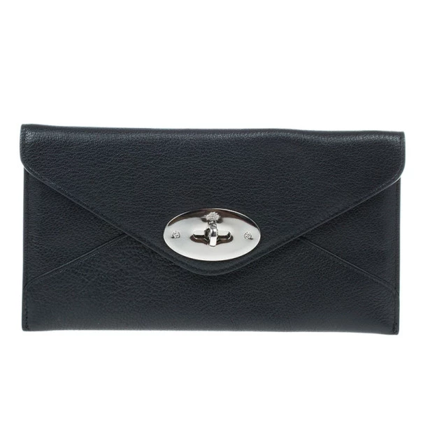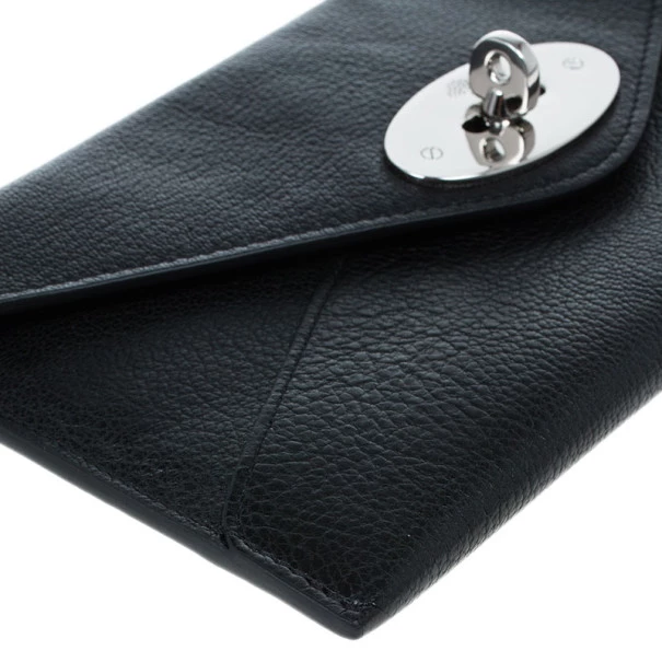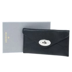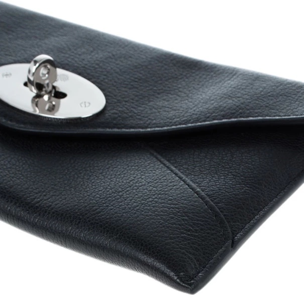 Keep your things organised in this sleek and chic Mulberry Envelope Wallet. Crafted from black supple lambskin leather, it features signature Mulberry twist lock closure. It has a back zipped pocket and it opens up to two compartments, four card slots and a bill compartment. Original Retail Price: US $452