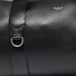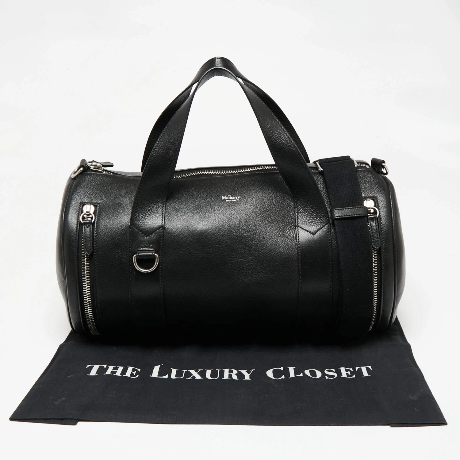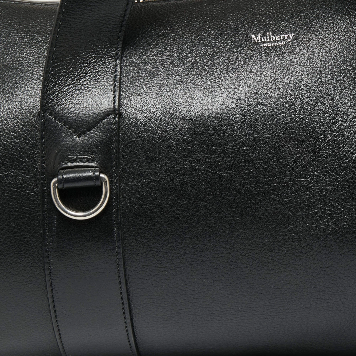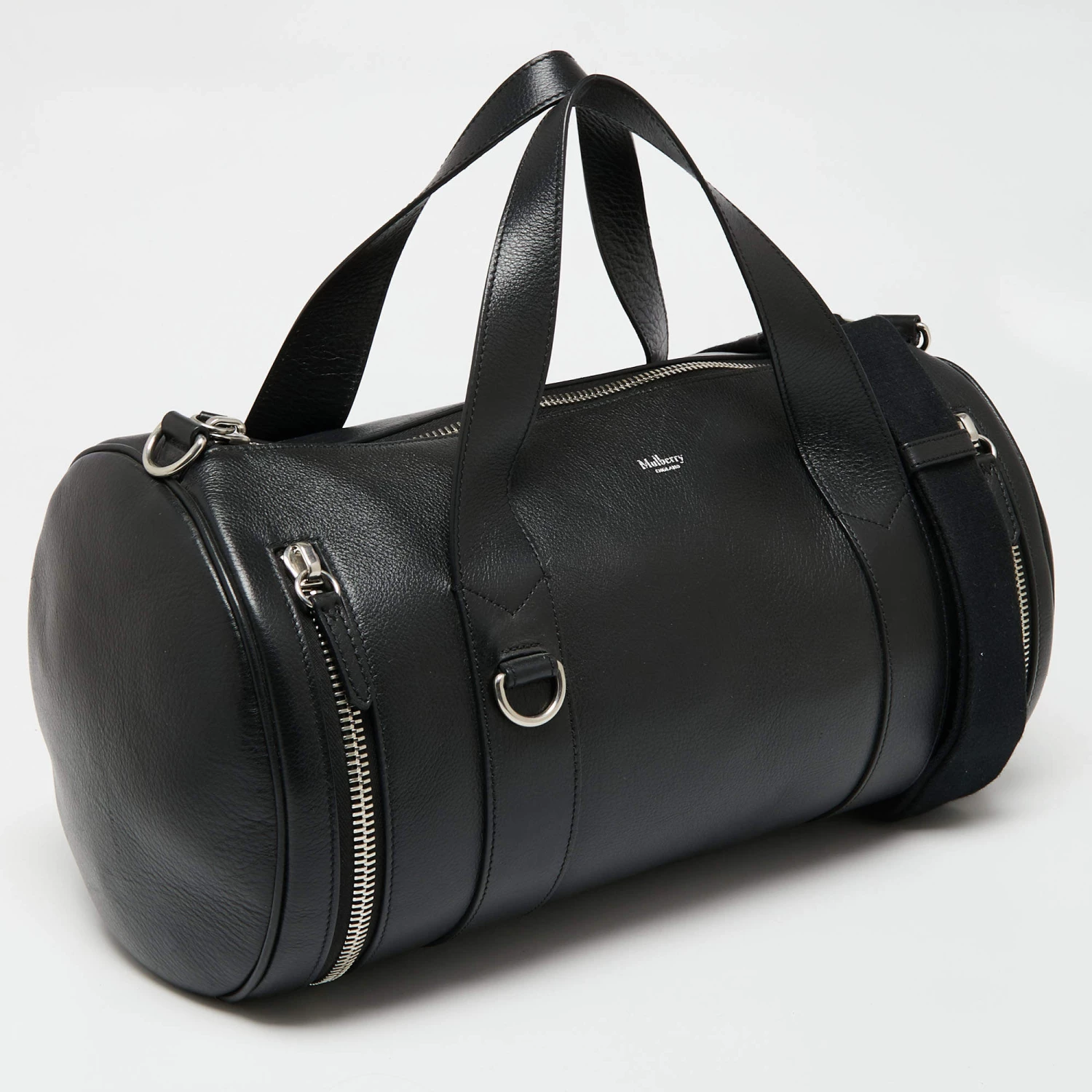 Plan weekend getaways and vacations seamlessly with this Mulberry duffel bag. Created from leather, its black exterior is equipped with front zipper pockets and a back zipper pocket. It can be carried around with dual handles at the top or the shoulder strap and gets a recognizable accent with the brand signature. Lined with canvas, it has optimum storage capacity for your belongings.