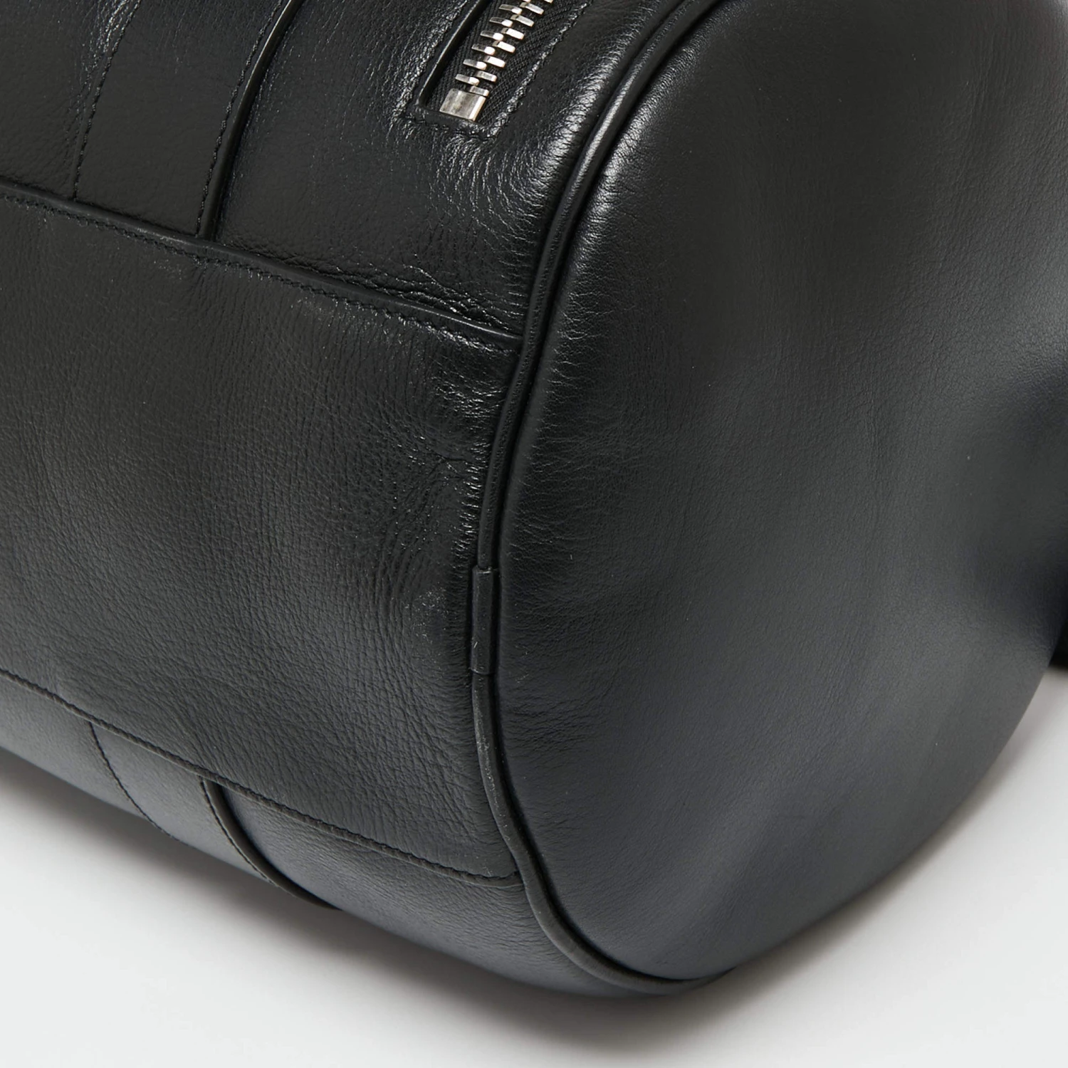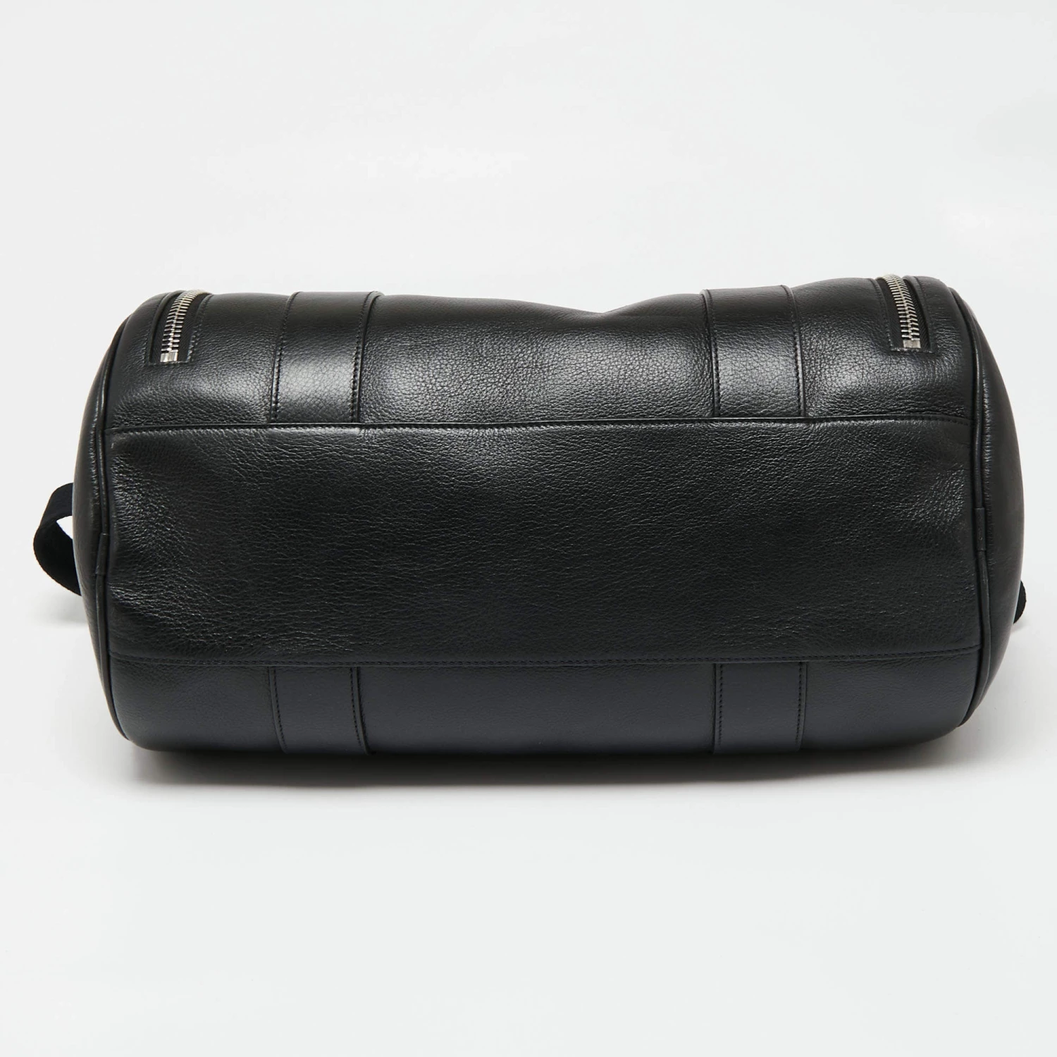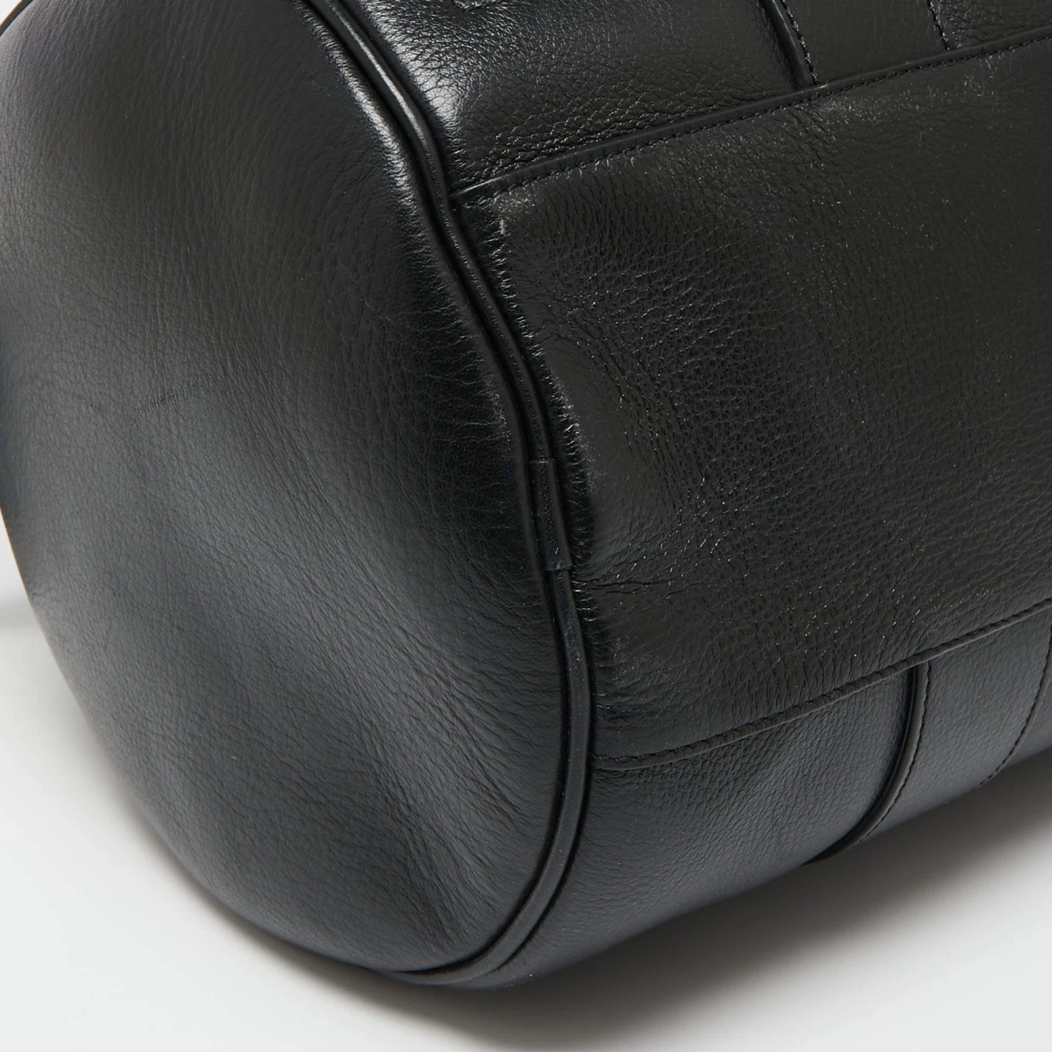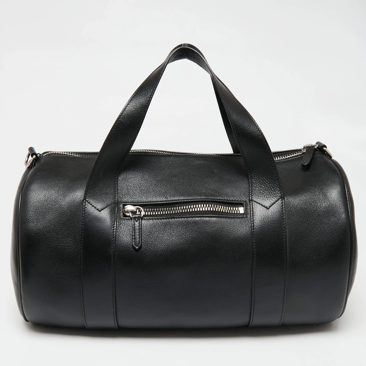 Plan weekend getaways and vacations seamlessly with this Mulberry duffel bag. Created from leather, its black exterior is equipped with front zipper pockets and a back zipper pocket. It can be carried around with dual handles at the top or the shoulder strap and gets a recognizable accent with the brand signature. Lined with canvas, it has optimum storage capacity for your belongings.