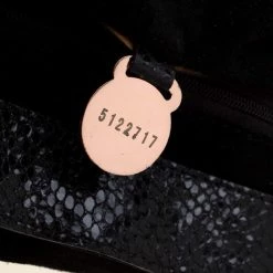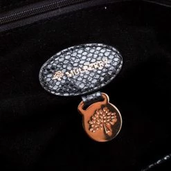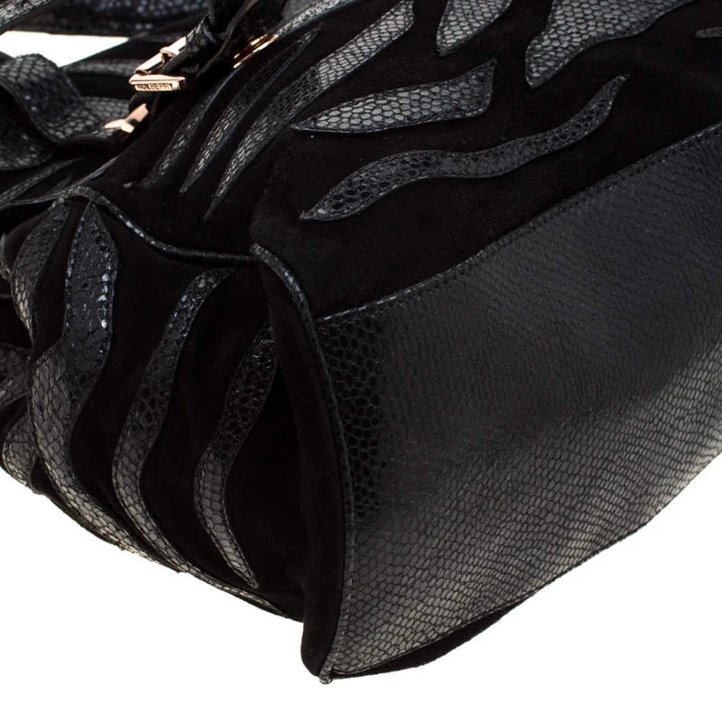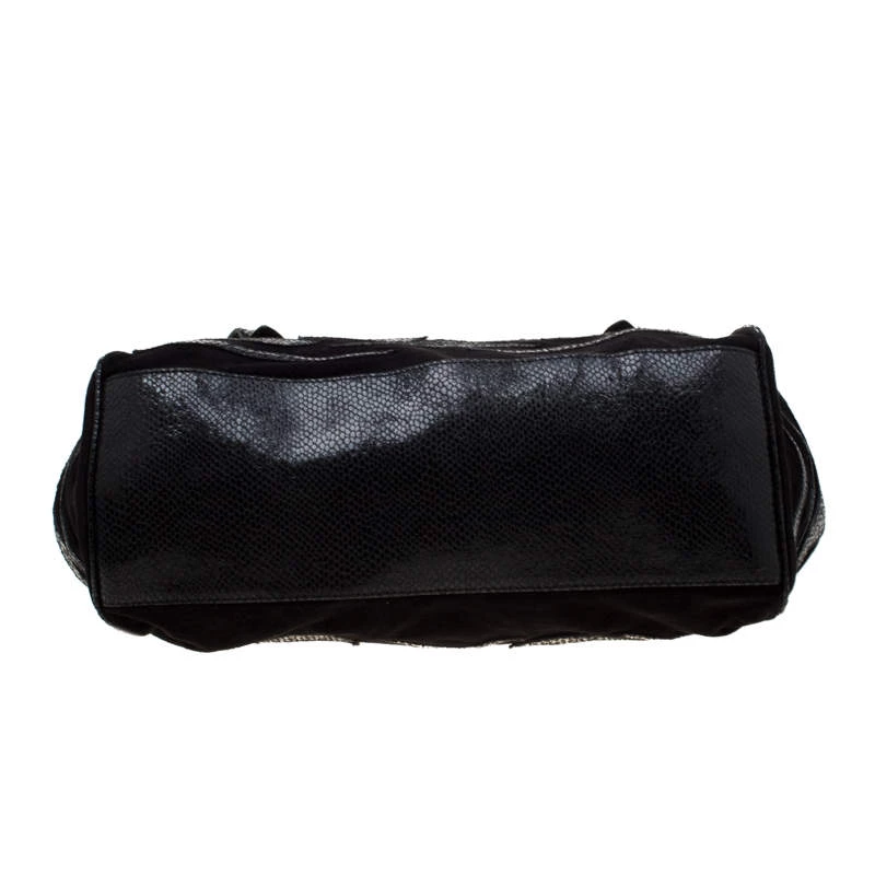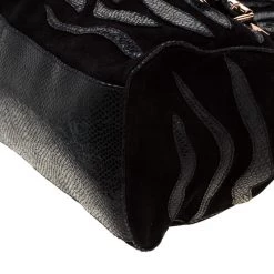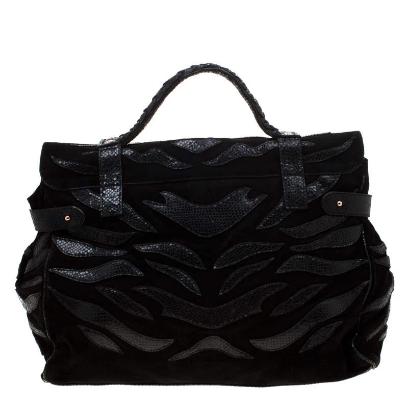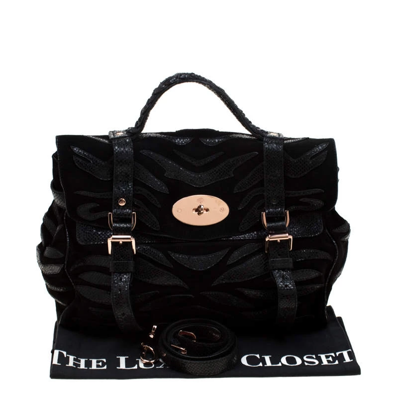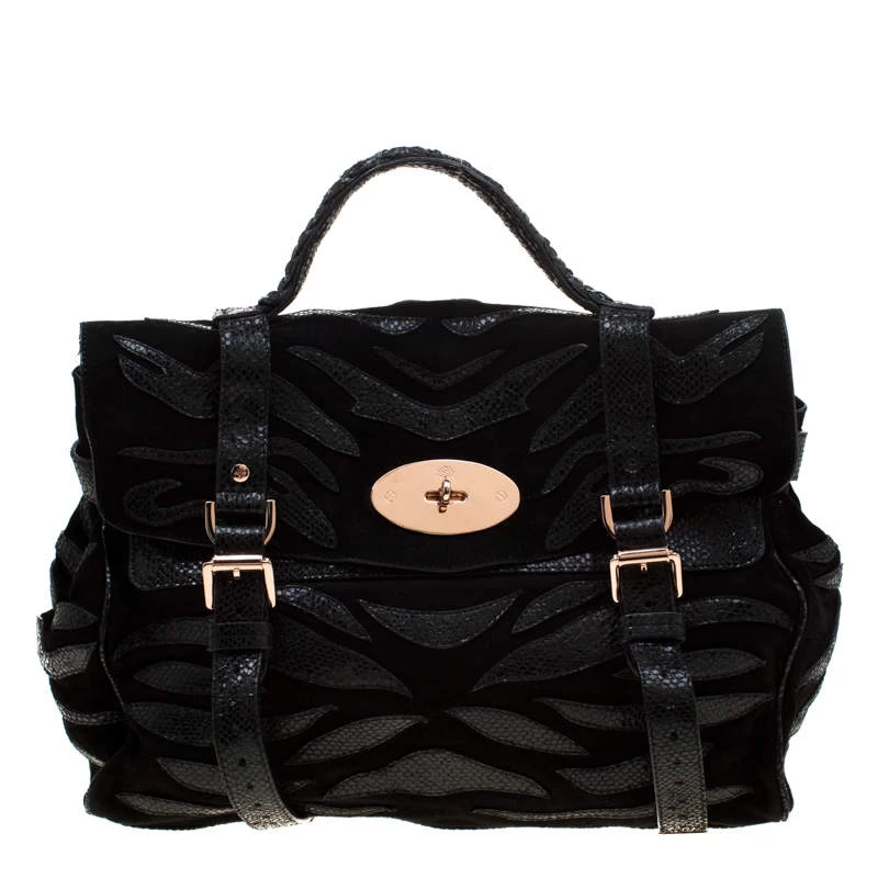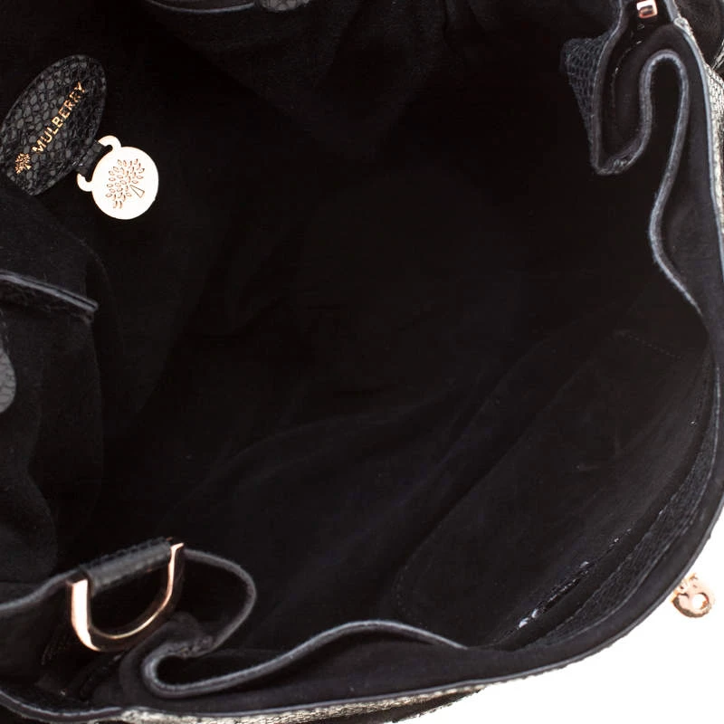 Mulberry brings you this handy bag that will dutifully support you wherever you go. It has been crafted from suede and lizard-embossed leather in black and equipped with a twist lock on the flap that secures a spacious suede interior capable of holding all your necessities. It is held by a single handle and a detachable shoulder strap.