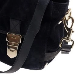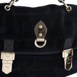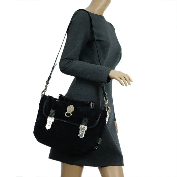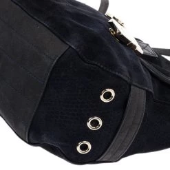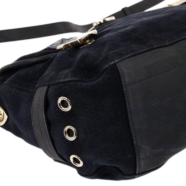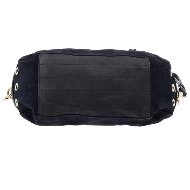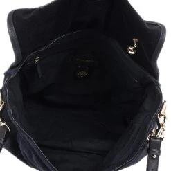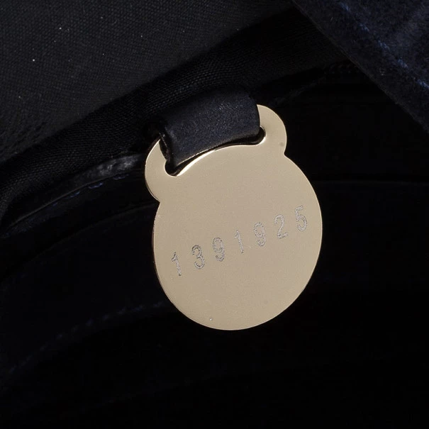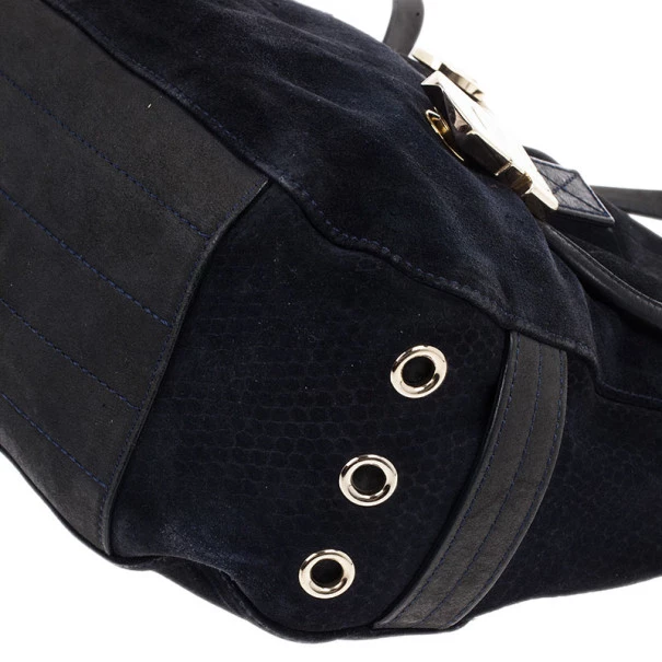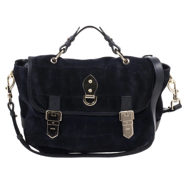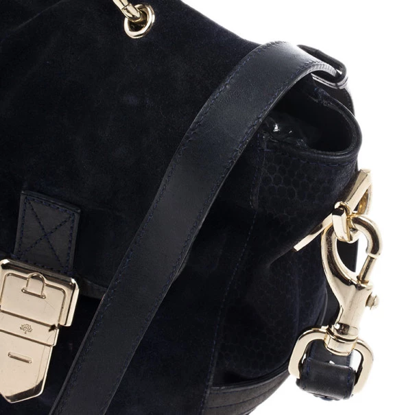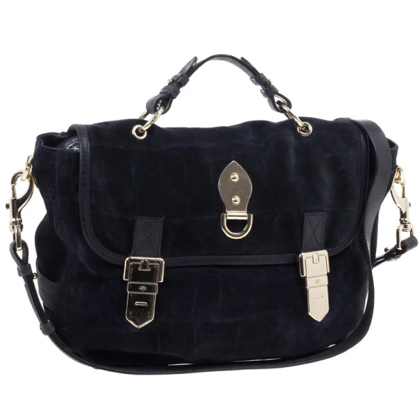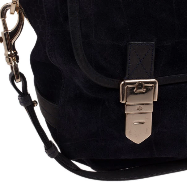 This Mulberry Tillie Tote is perfect for everyday use! Crafted from soft suede and adorned with matching blue leather, this bag can be carried by hand or as a shoulder bag. It features two front buckles in gold-tone hardware, as well as a push lock to open and close the bag. Its sides feature croc embossed suede, as well as two slip pockets. Its interior is lined with black lined canvas and houses a single slip pocket for storing smaller items.Original Retail Price: US $1,390