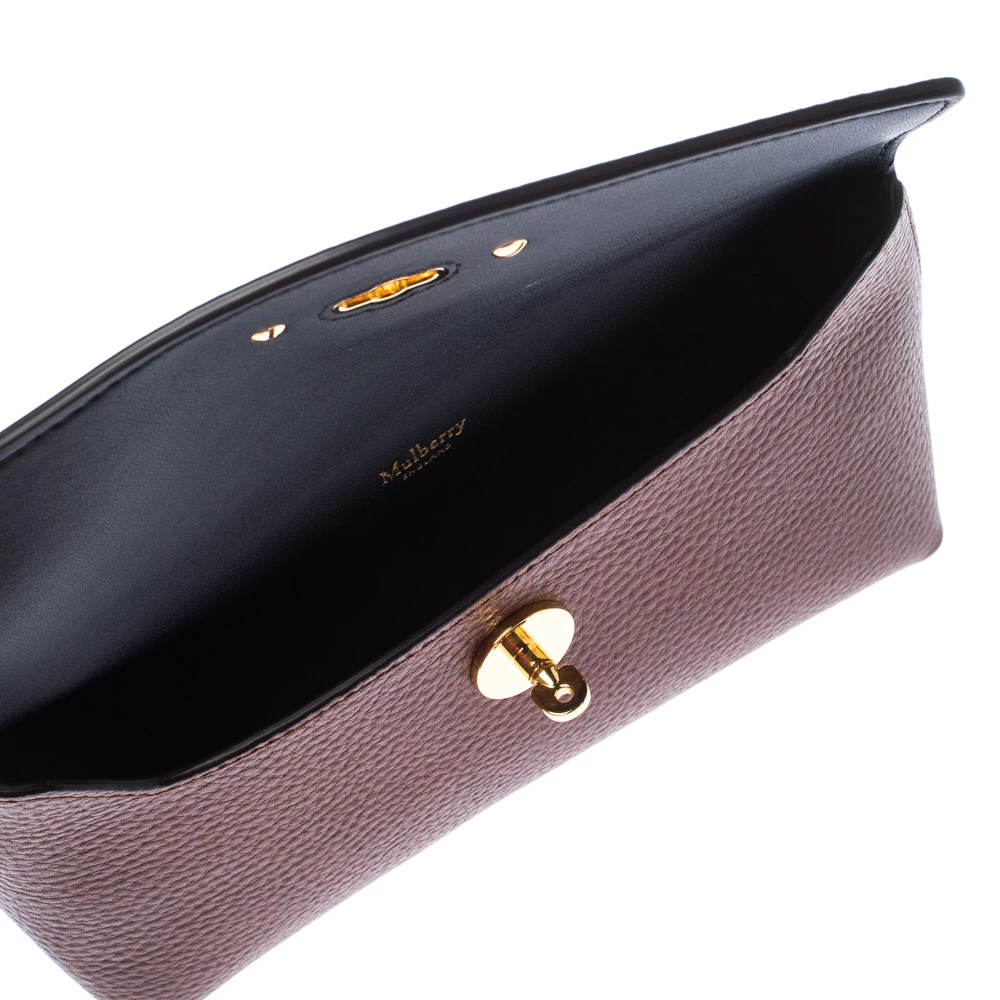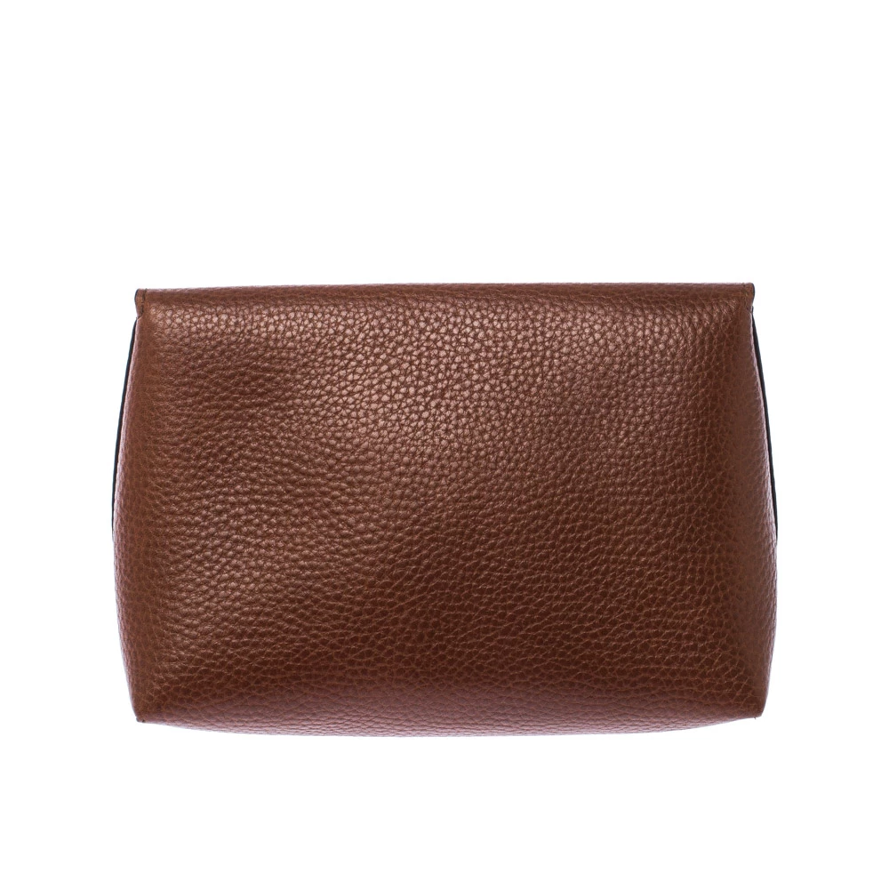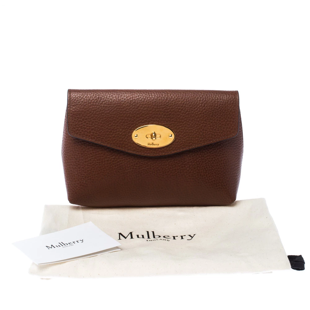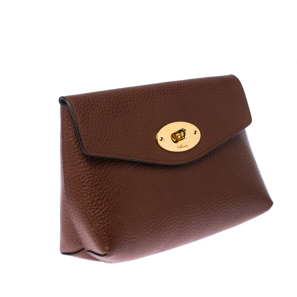 This cosmetic pouch from the house of Mulberry has been expertly crafted from leather and secured with a signature twist lock in gold-tone. It comes with a leather interior that can easily hold your cosmetics. Carry it while travelling to neatly organise your essentials.