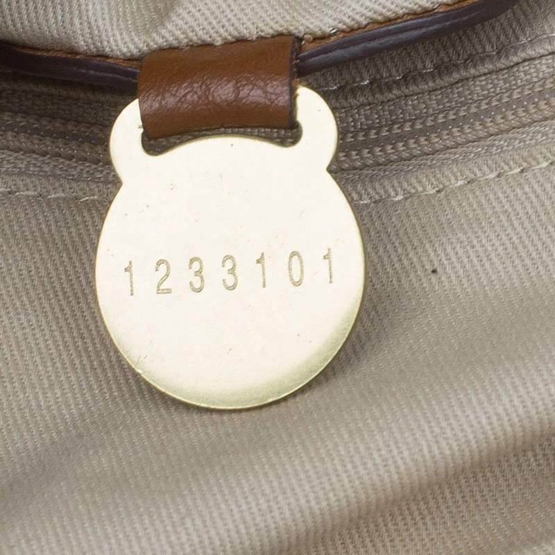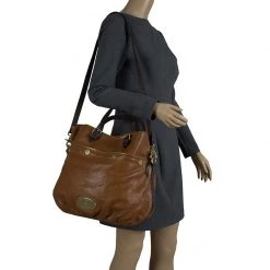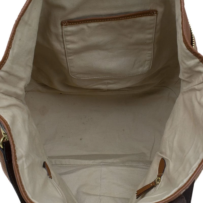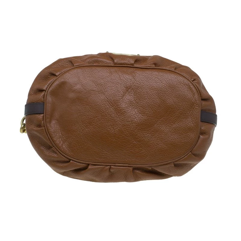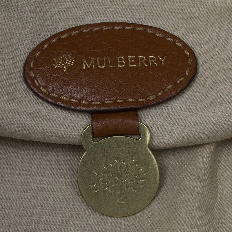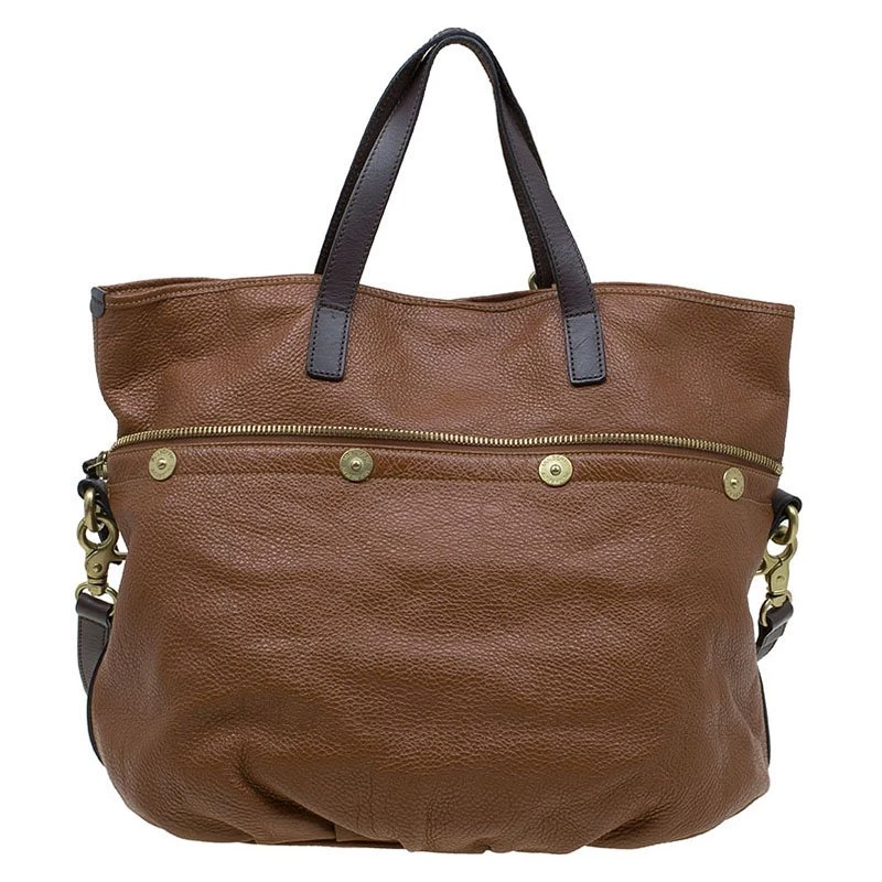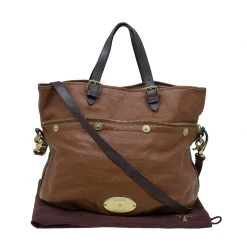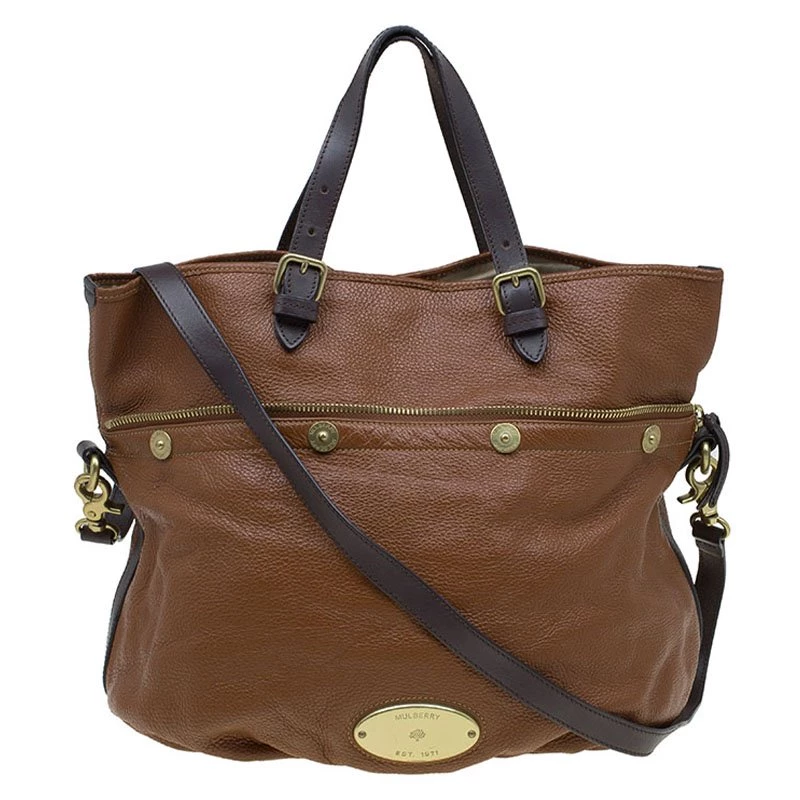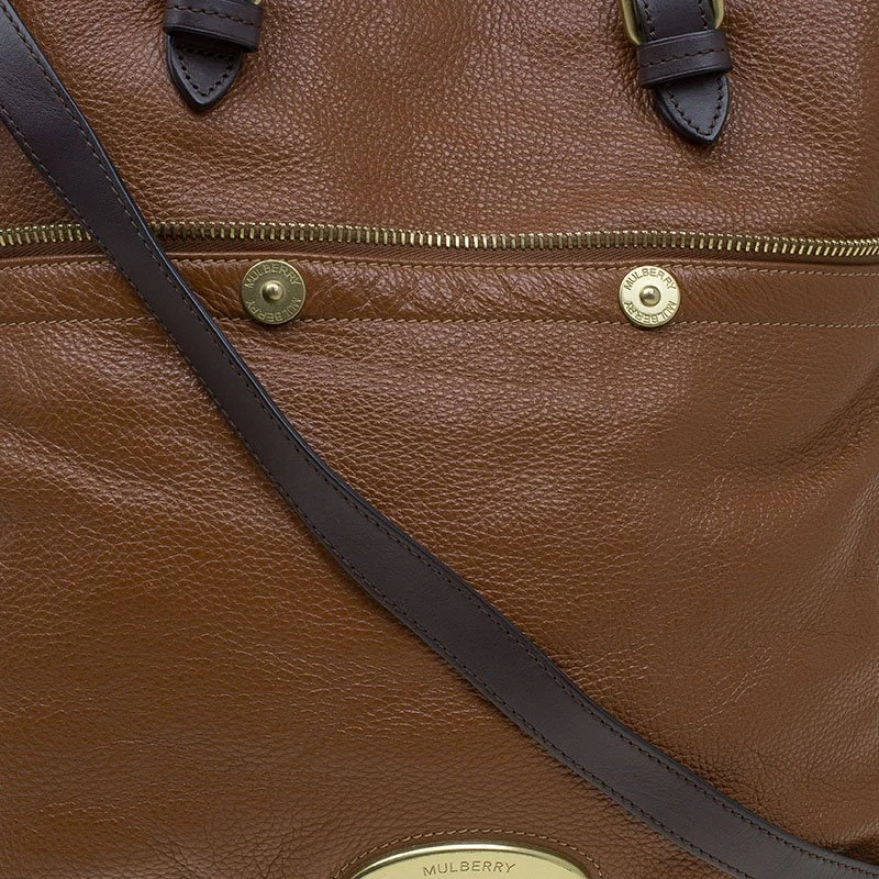 This versatile tote from Mulberry has a unique design. Crafted from brown leather it features gold-tone studs, a top exposed zipper and a metal plaque. It has blue colored handles and a removable shoulder strap. The fabric lined interior has one zip and one slip pocket. The tote is ideal for daily use.
