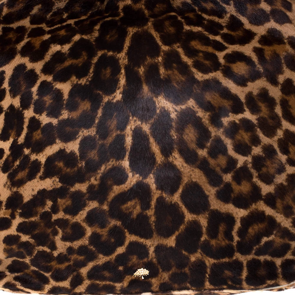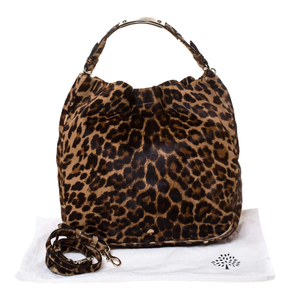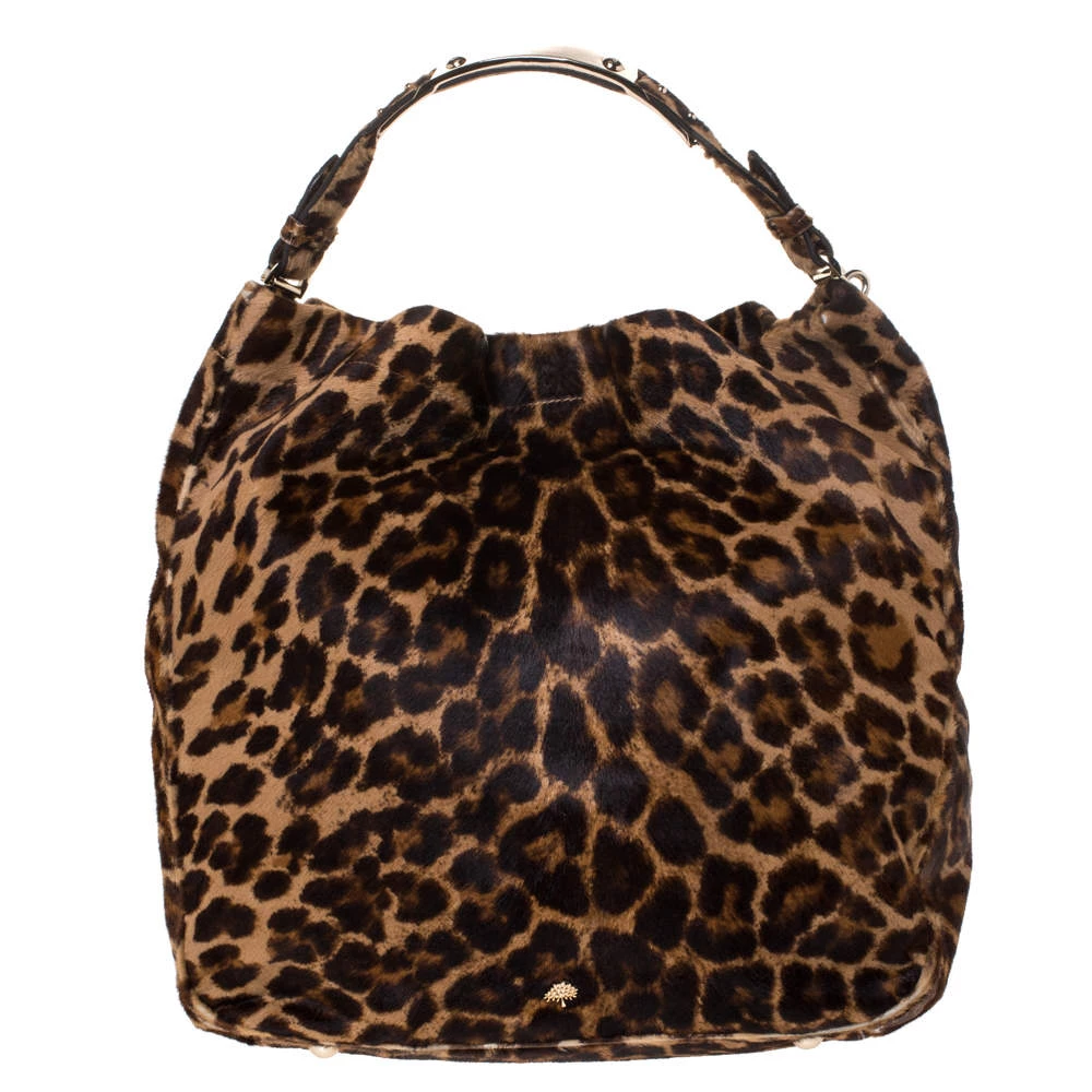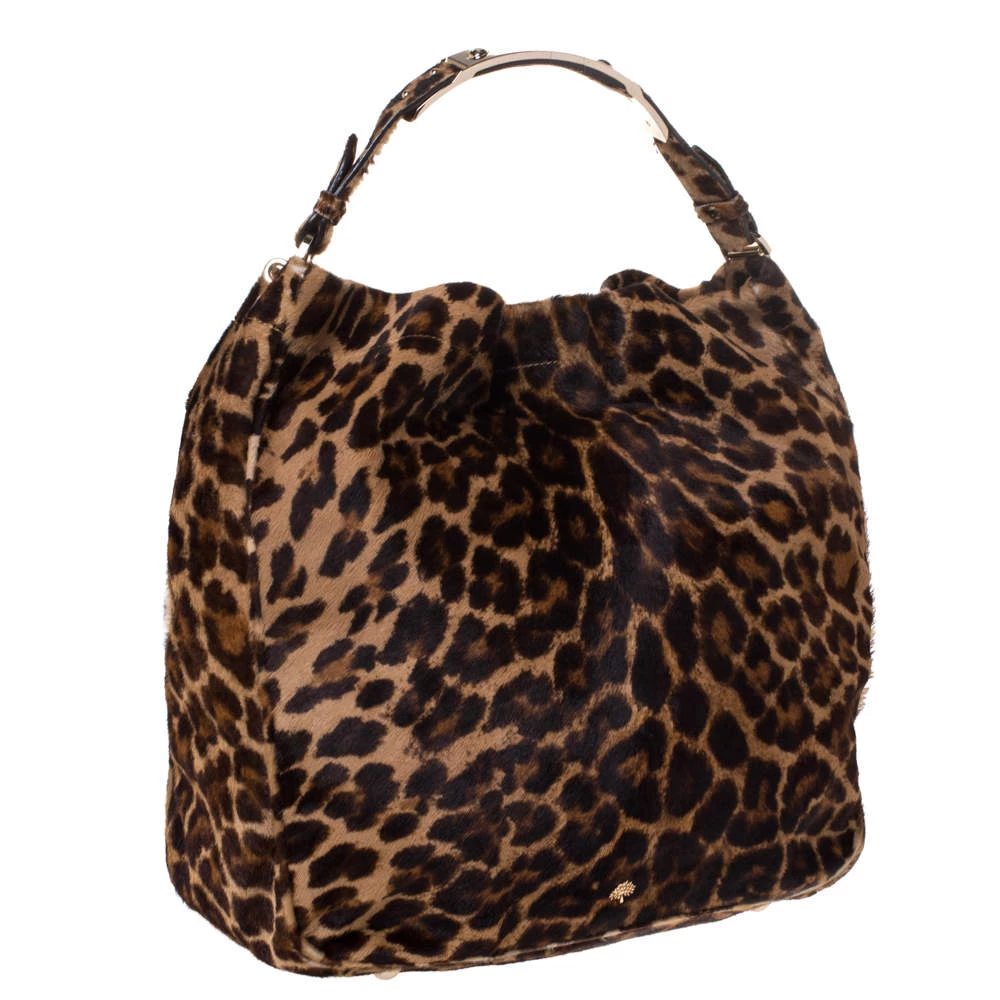 Add some effortless style and luxury to your everyday looks with this stunning Mulberry bag. Crafted in Spain, it is made of exotic calf hair and decorated with a leopard print in the shade of brown all over. It has a lovely silhouette with a slight gathering at the top and the brand logo at the front. It opens to a suede-lined interior with a zip pocket that can store all your essentials. The bag is equipped with a single top handle and a detachable shoulder strap.