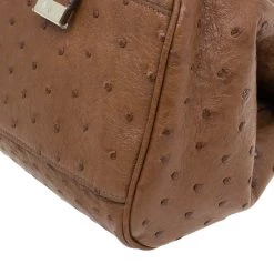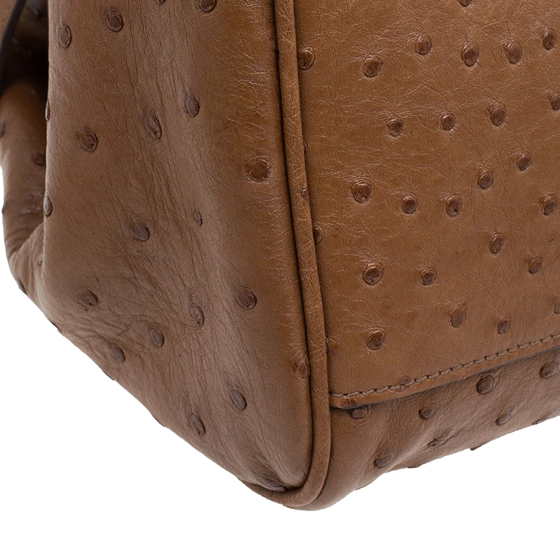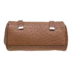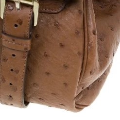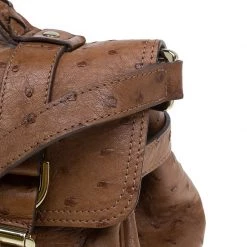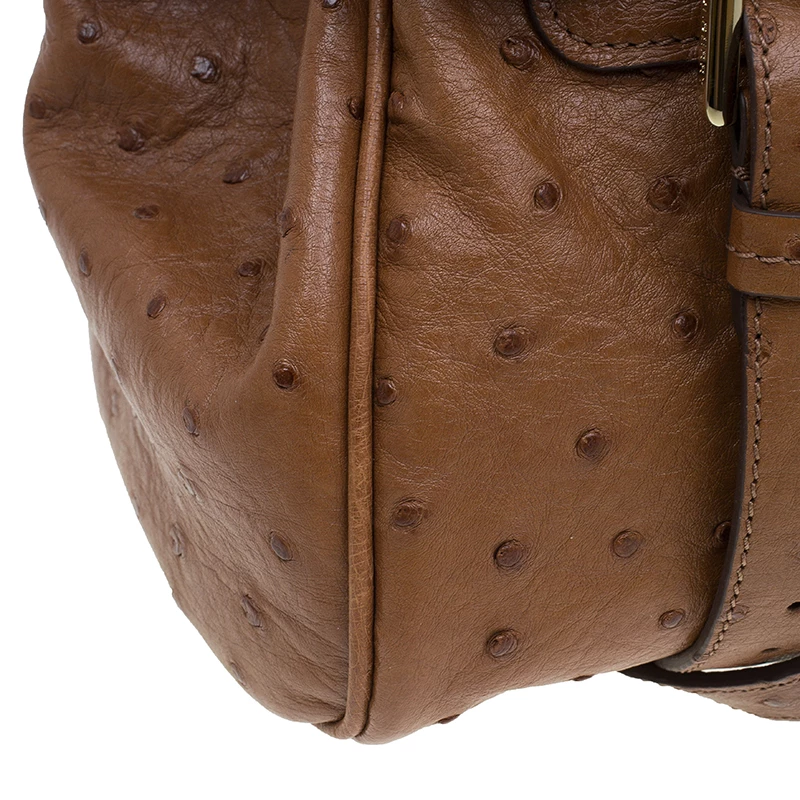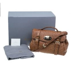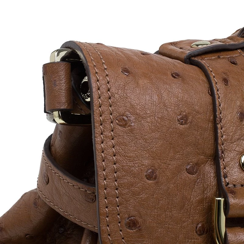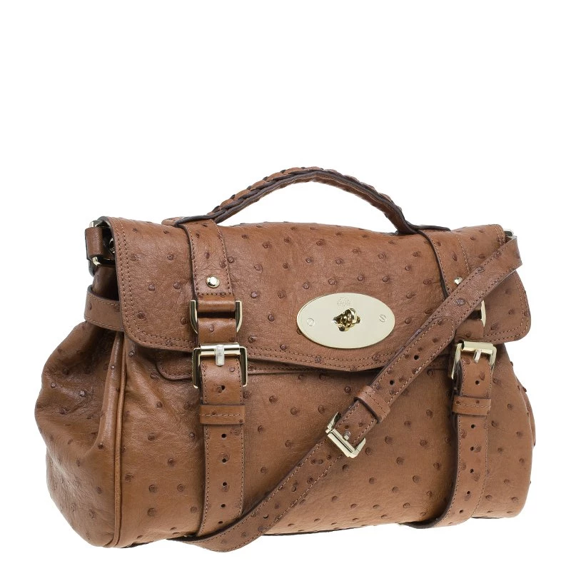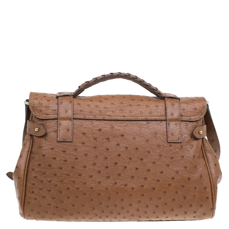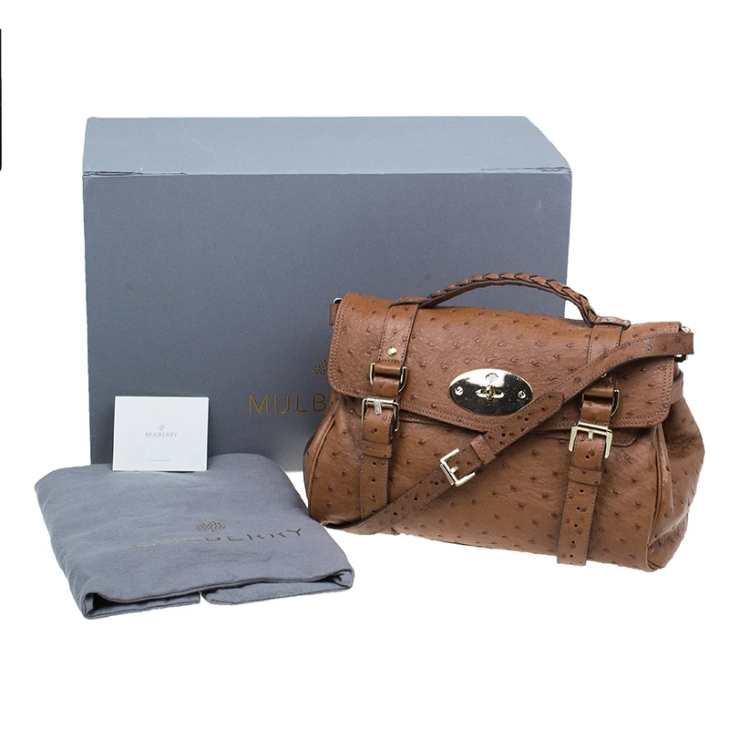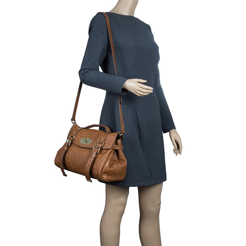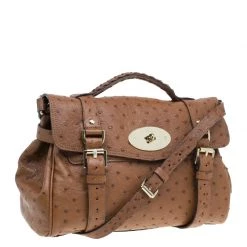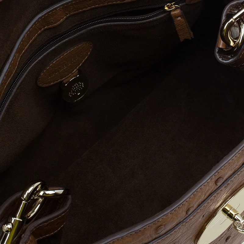 This splendid Alexa satchel bag from the house of Mulberry is extremely beautiful. It has been crafted to finesse in brown ostrich leather and features double belt fastening as well as a twist lock closure in gold-tone. It has a leather top handle and a shoulder strap. The flap opens to a roomy suede lined interior with one zipped pocket.