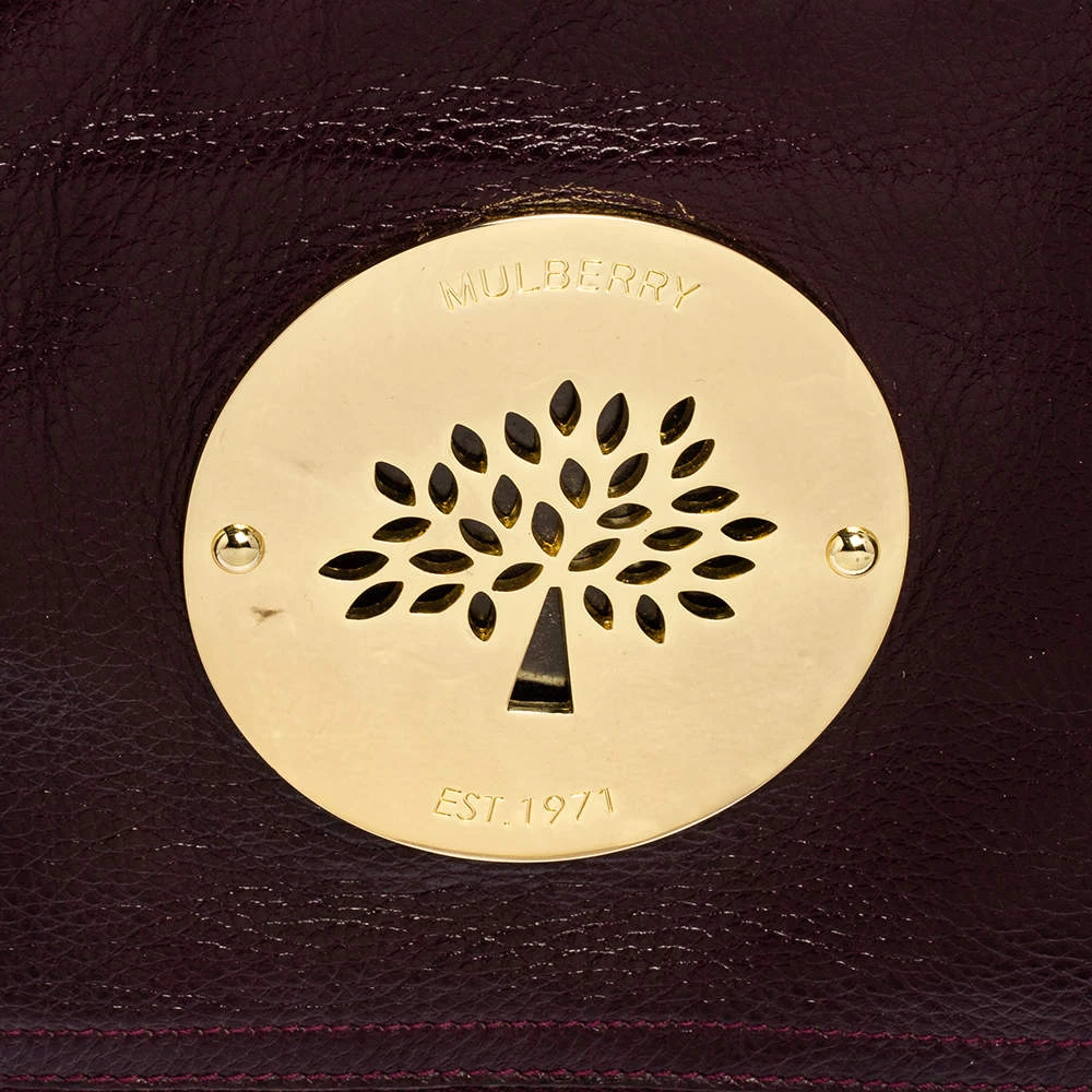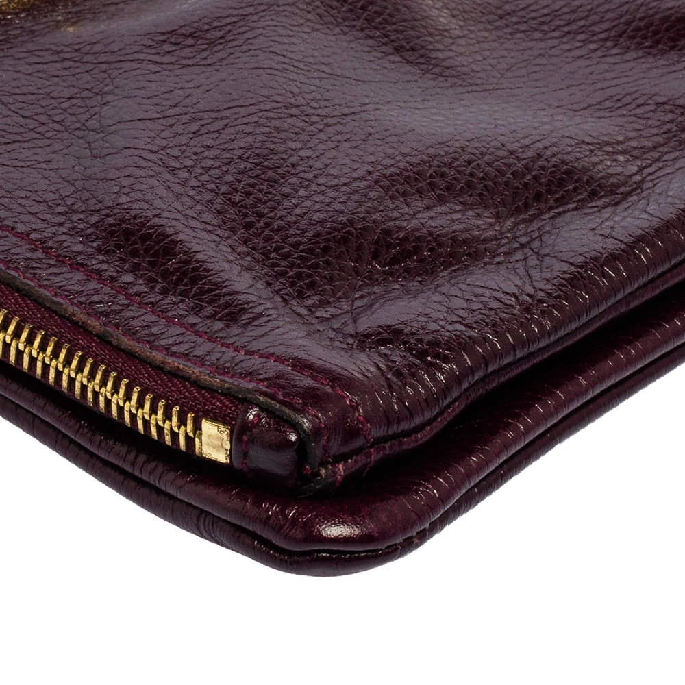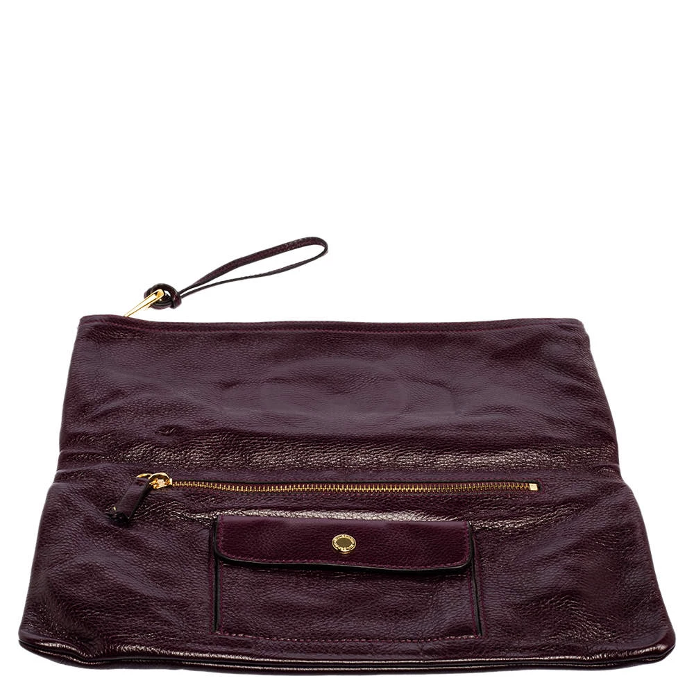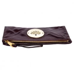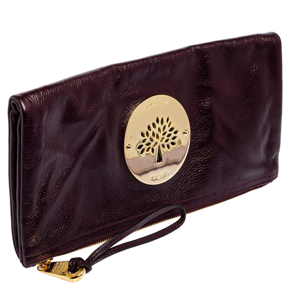 Mulberry brings you this gorgeous clutch that has been crafted from leather and styled as a fold-over. It carries a burgundy hue with a well-sized fabric interior and the brand plate on the front. The clutch is complete with a wrist strap.