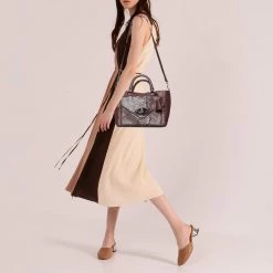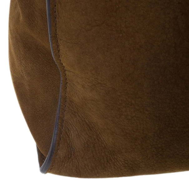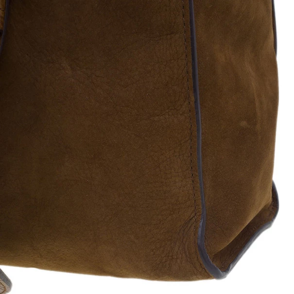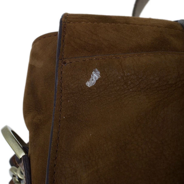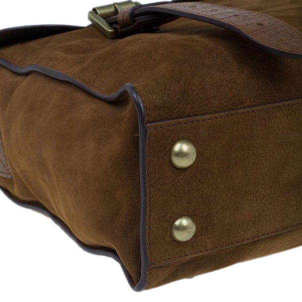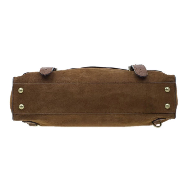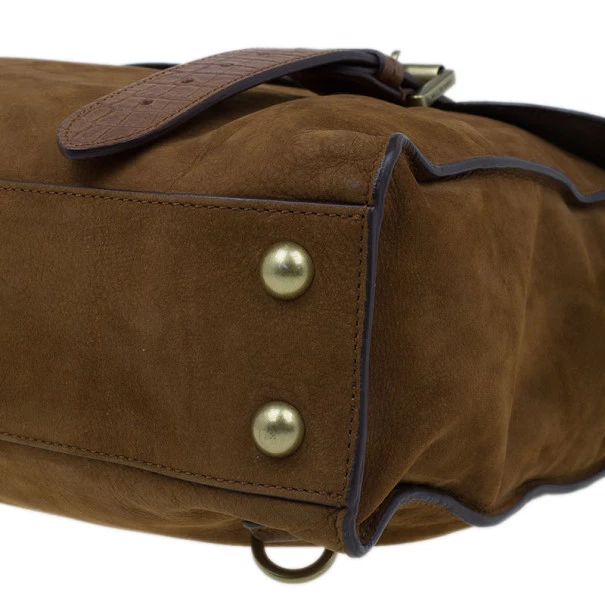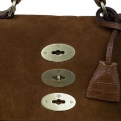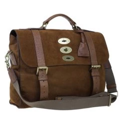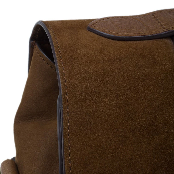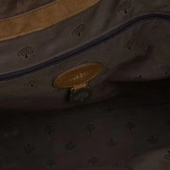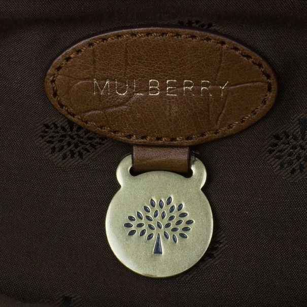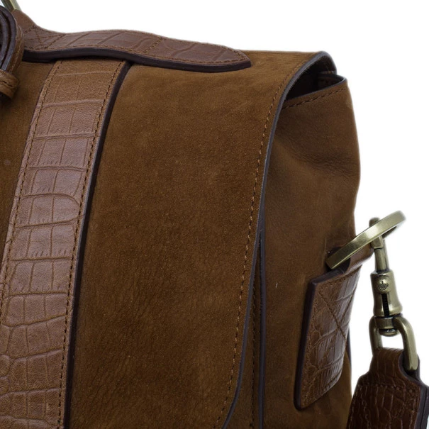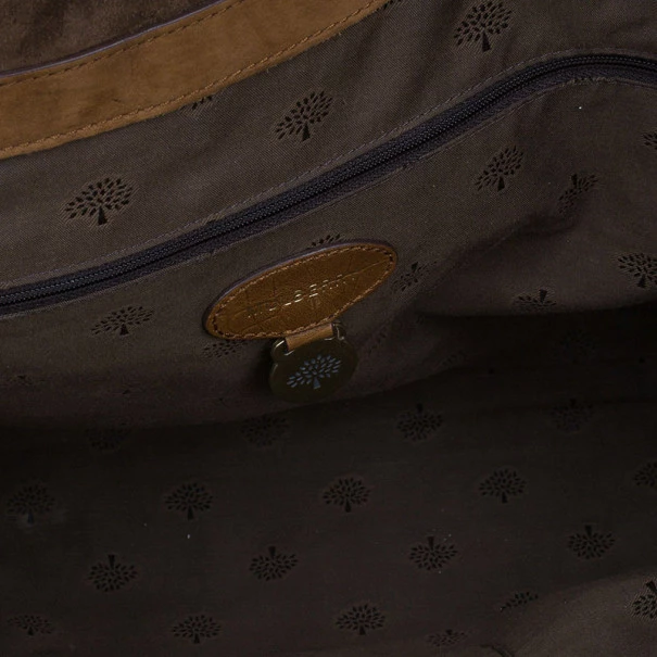 Exuding the aesthetic of classic messenger and travel bags, this Mulberry convertible is a true beauty. Its sophisticated appeal is crafted from brown suede with an embossed leather trim, three golden twist locks, a removable and adjustable shoulder strap, and buckled front straps. Its clochette, keys, and top handle are coupled with a brown monogrammed fabric featuring the Mulberry tag, charm, and a zipped pocket.