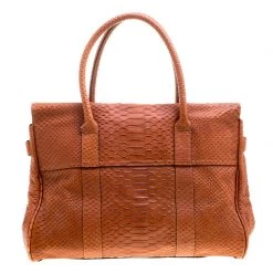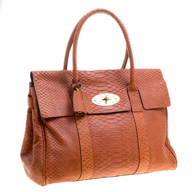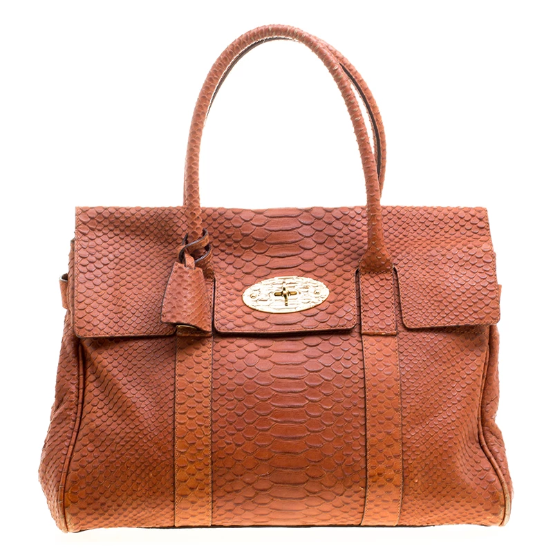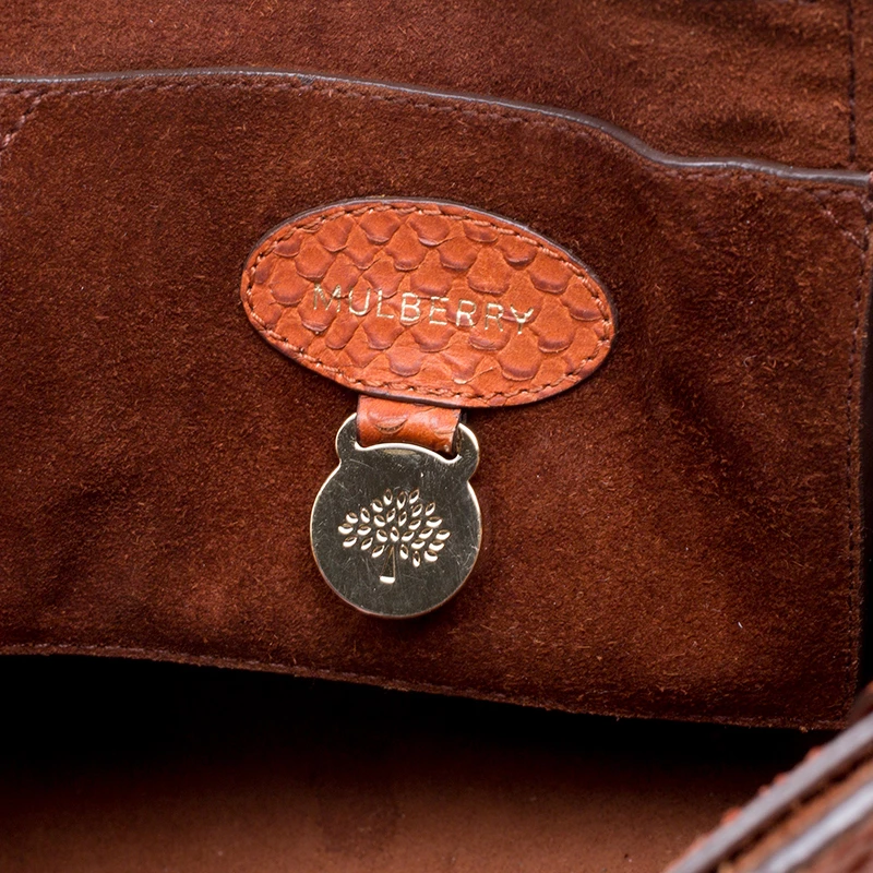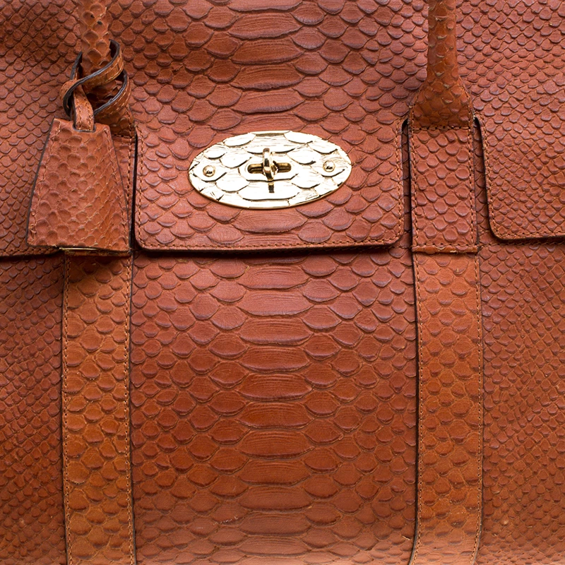 Satchels like these are hard to come by, so quickly grab one when you can. Crafted from python-embossed leather, this Mulberry bag is equipped with dual top handles, a leather tag, and protective metal feet at the bottom. The turn lock closure opens to a spacious leather lined interior that houses a zip pocket.