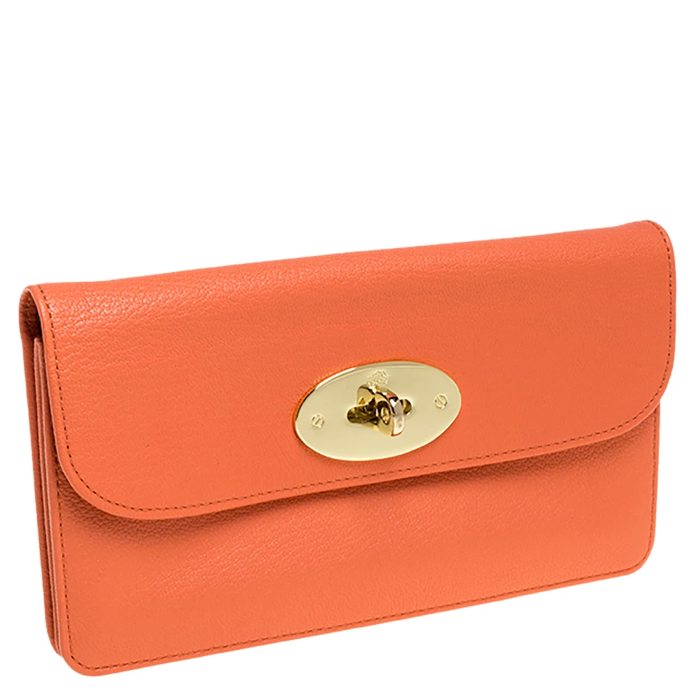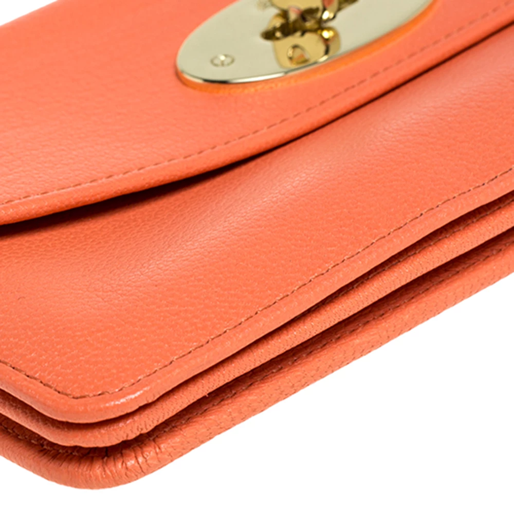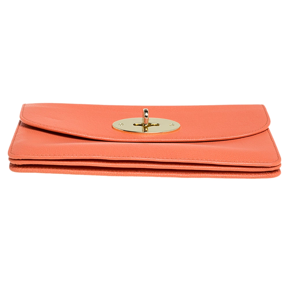 Mulberry introduces a stylish piece of accessory for the modern urbane woman. This orange clutch is just what you need to take your style quotient a few notches higher. It has been crafted from leather and styled with the signature postman lock on the front flap. It opens to a fabric interior that houses a zip pocket and multiple card slots and will probe to be a worthy accessory!