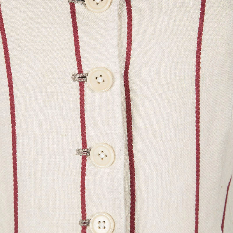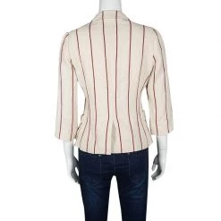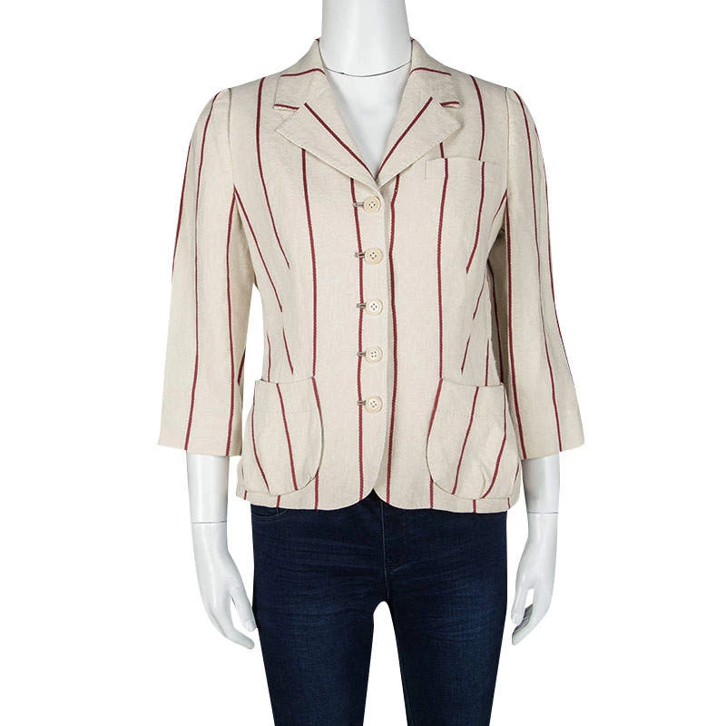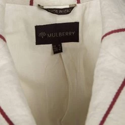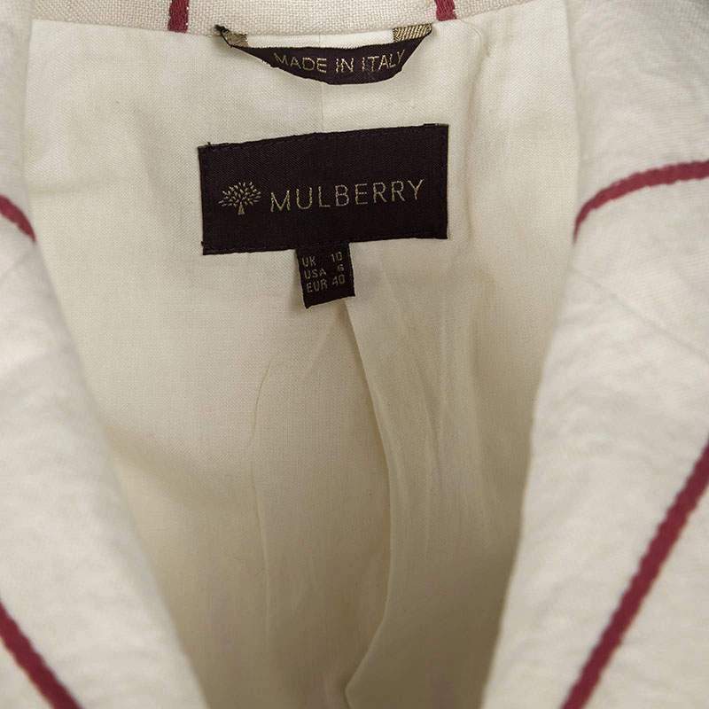 Smarten up your everyday casuals instantly by adding this casually chic Mulberry blazer, perfect for everyday day time use. Constructed in cotton and linen blended fabric, and with red stripes on the cream backdrop, this blazer features lapel collars with front button down closure along with two open pockets to complete the look.