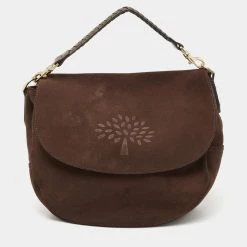 Easy to carry and stylish in appearance, this Effie satchel from Mulberry will certainly be your favorite pick this season. It is crafted using dark-brown suede and leather, with gold-tone hardware elevating its beauty. It provides two handles and a spacious suede-lined interior.