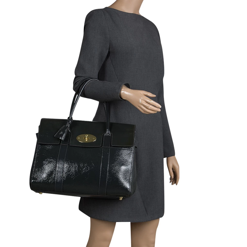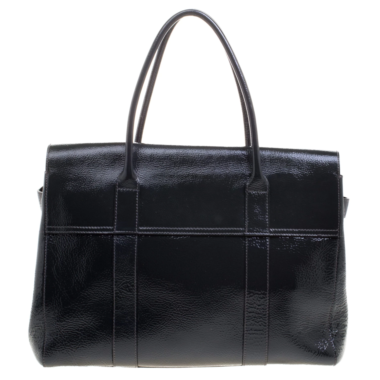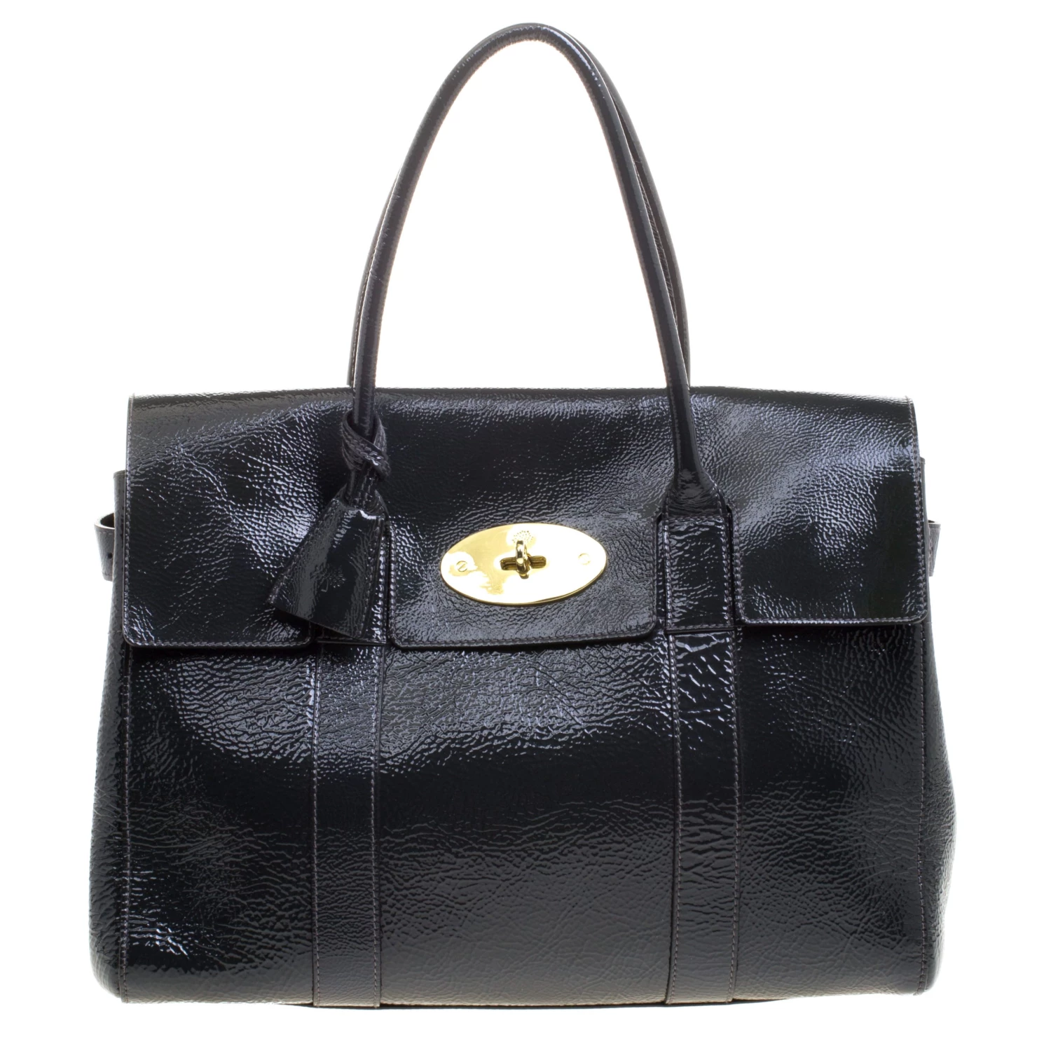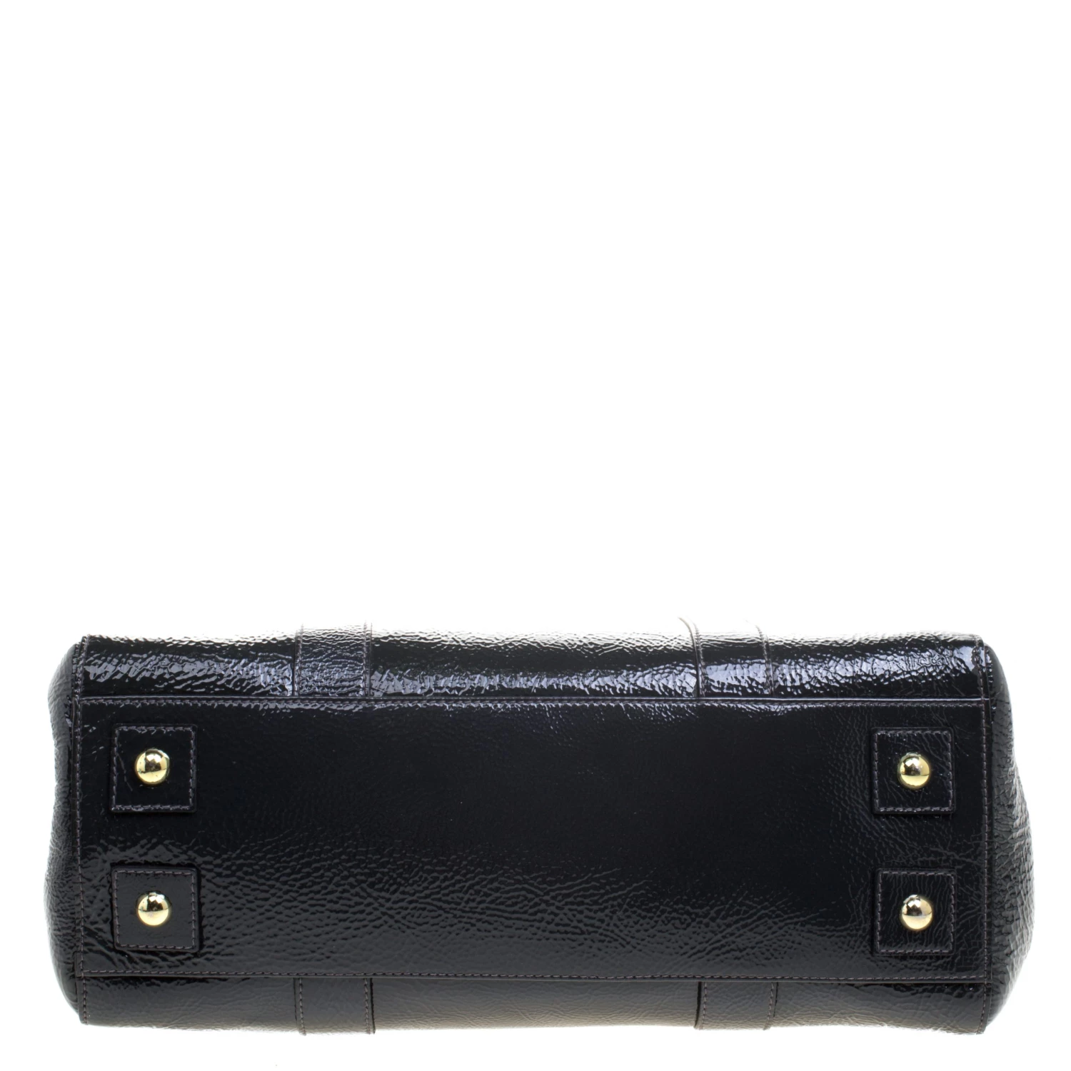 Satchels like these are hard to come by, so quickly grab one when you can. Crafted from patent leather, this Mulberry bag is equipped with dual top handles, a leather tag, and protective metal feet at the bottom. The turn lock closure opens to a spacious suede lined interior that houses a zip pocket and two slip pockets.