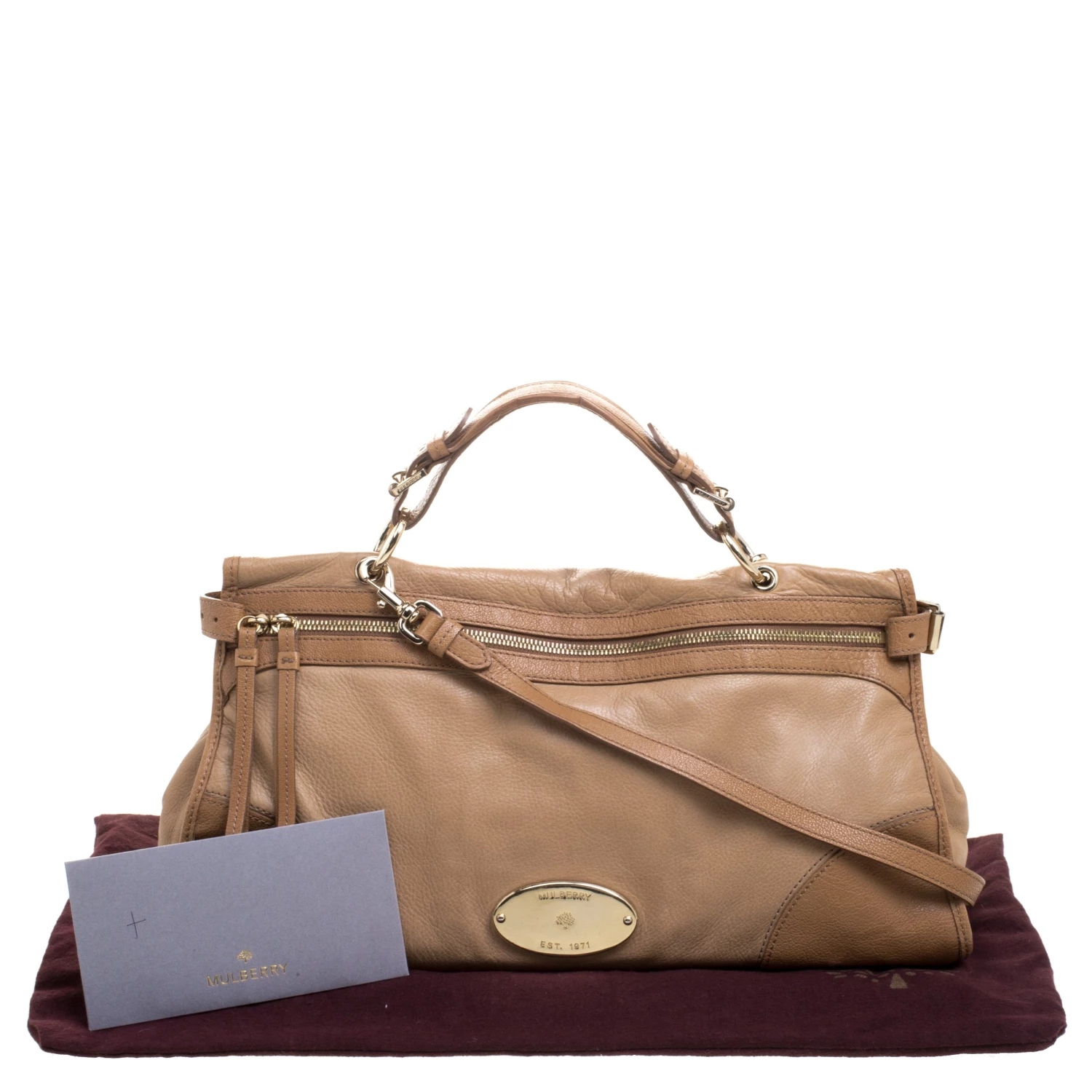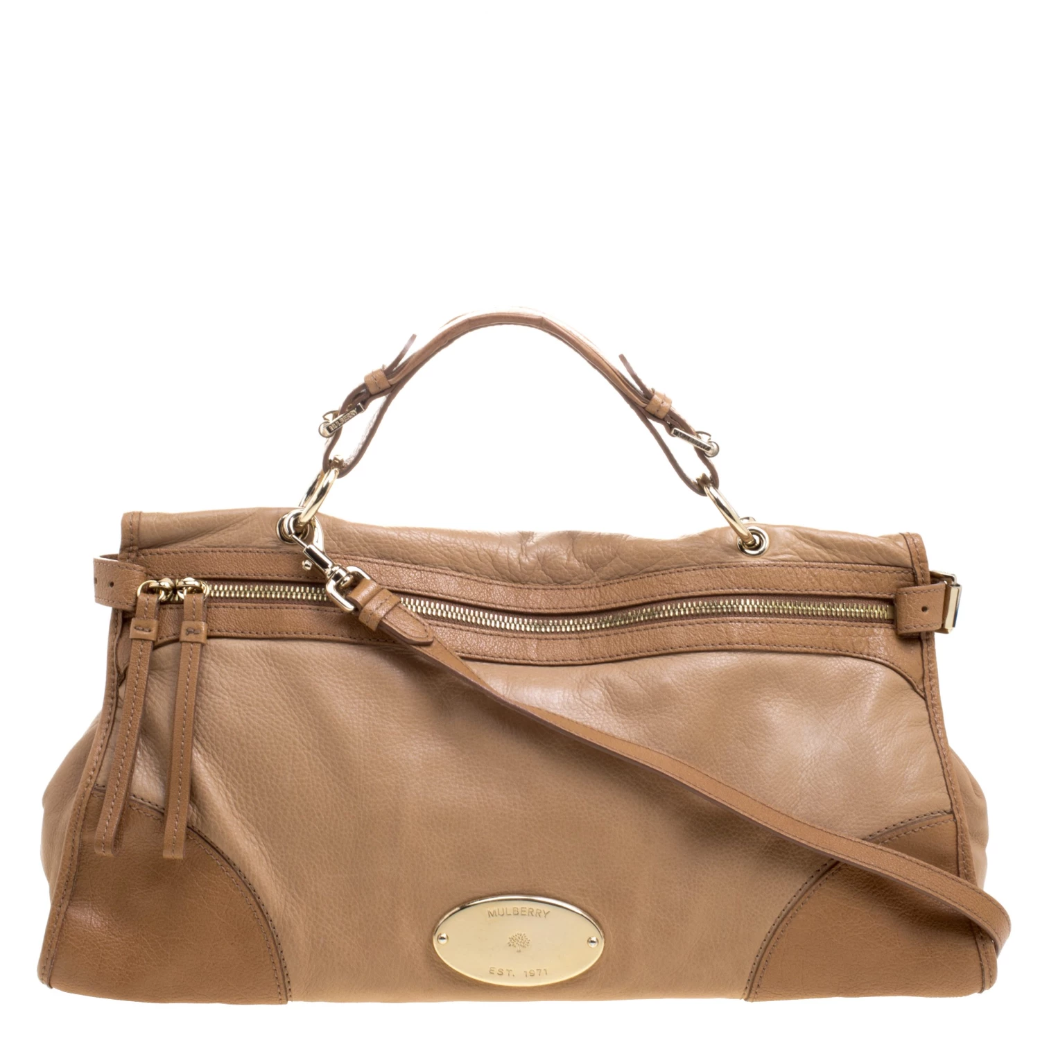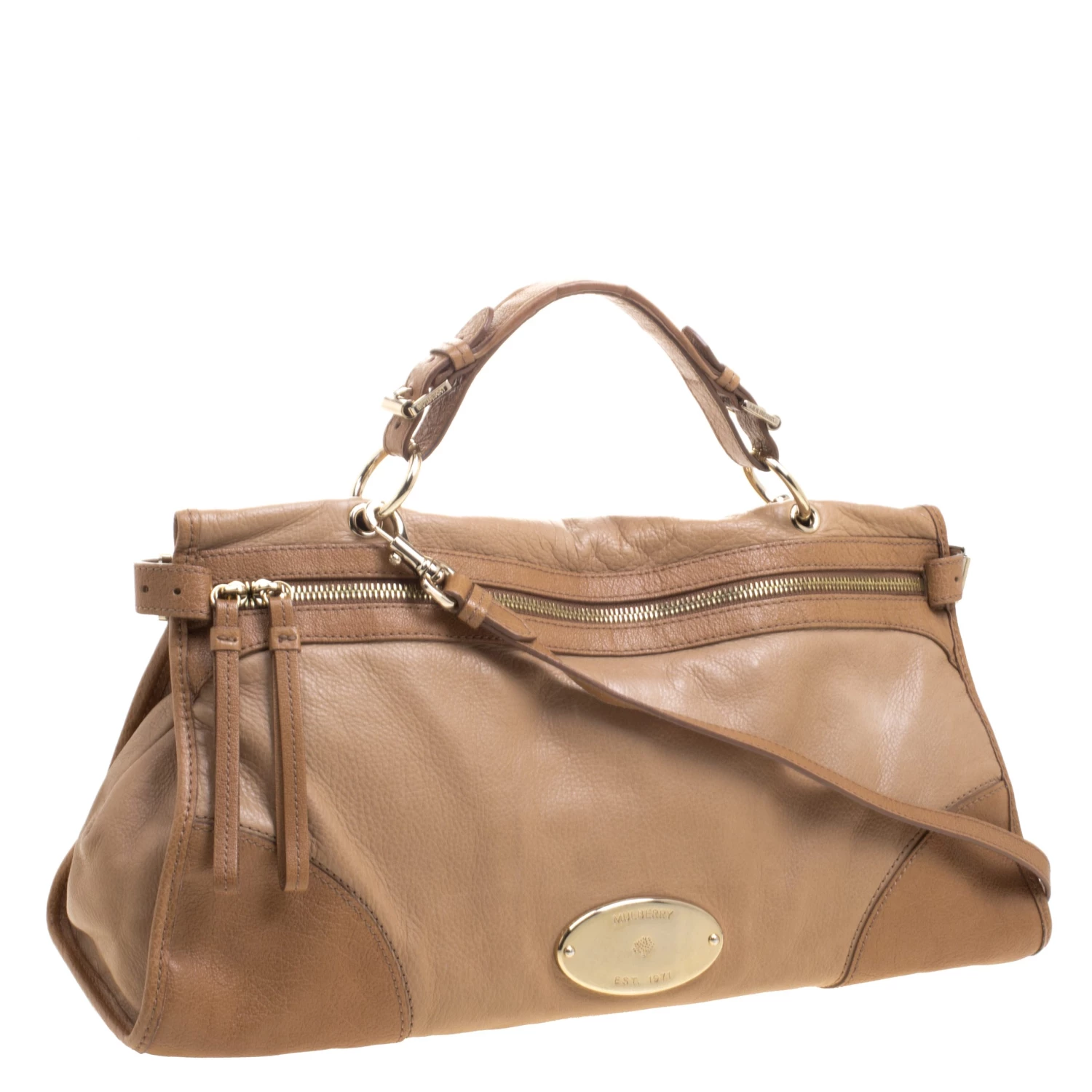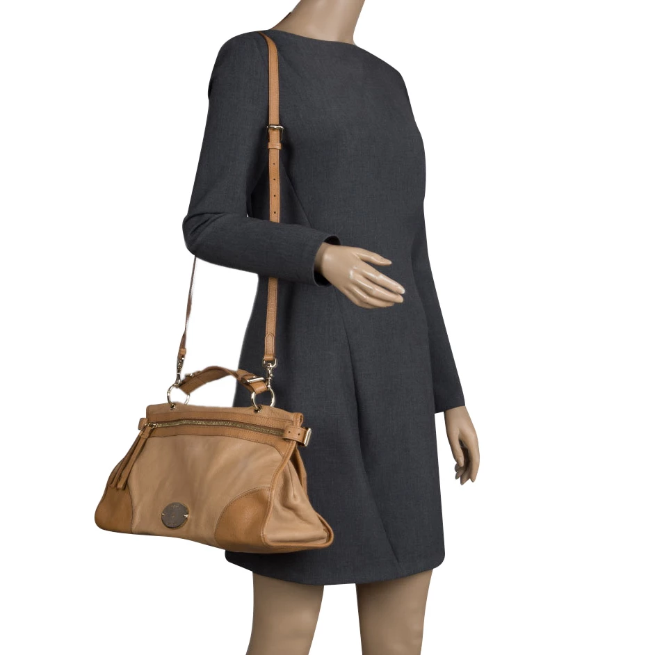 Shoulder bags from Mulberry are hard to come by, so invest in one when you can. Crafted from light brown leather, the bag is equipped with a top handle and a removable shoulder strap. The front zip closure opens to a fabric lined interior that is spacious and will hold all your daily necessities.