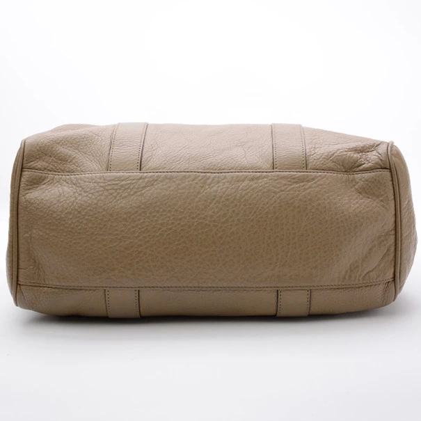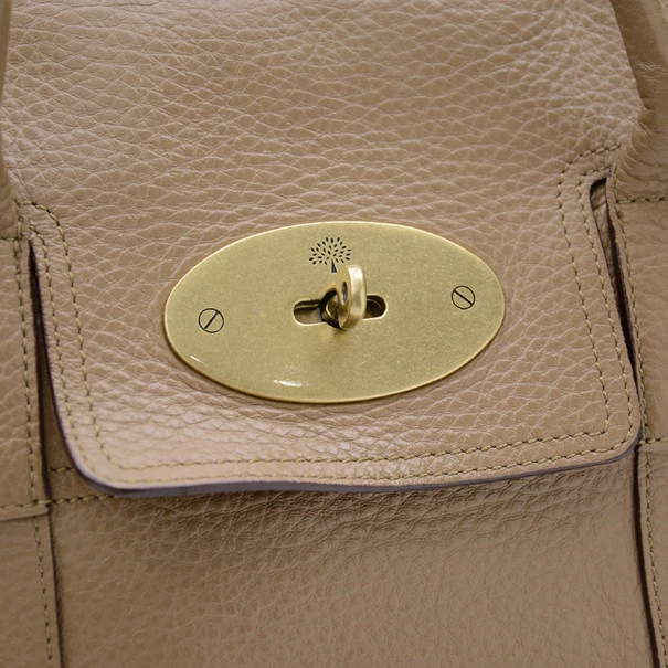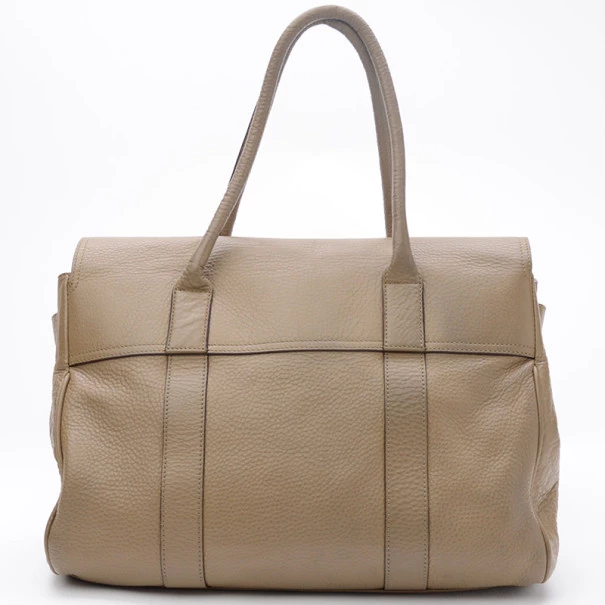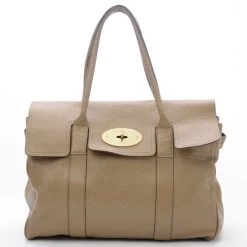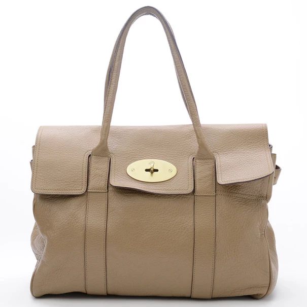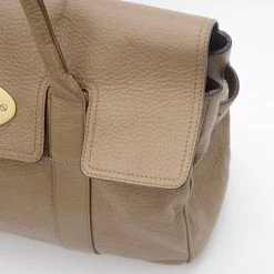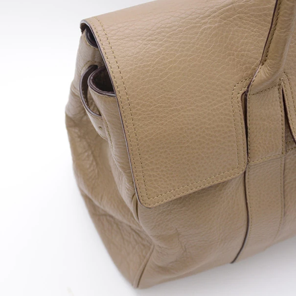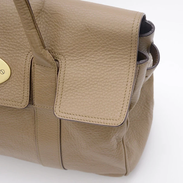 This Mulberry Bayswater Tote is designed for the busy professional woman of today. It is crafted from leather with matching leather trim and features a short front flap closure with a metallic gold twist lock, a gold Mulberry padlock, four feet for firm standing and short rolled leather straps. The unlined interior houses a side zip pocket, two small compartments and a Mulberry label.Original Retail Price: US $1,080