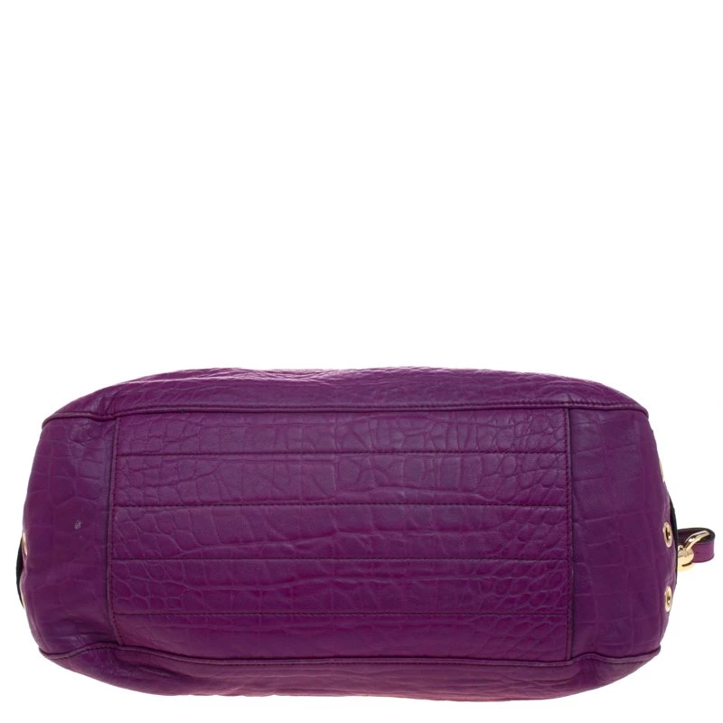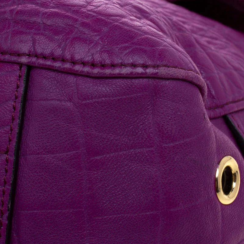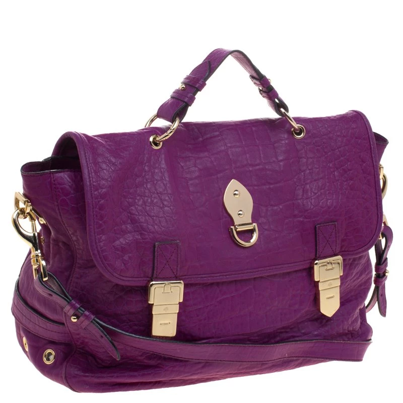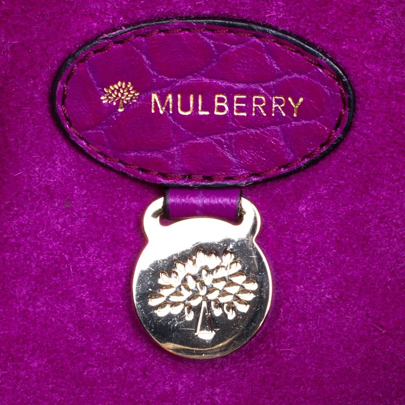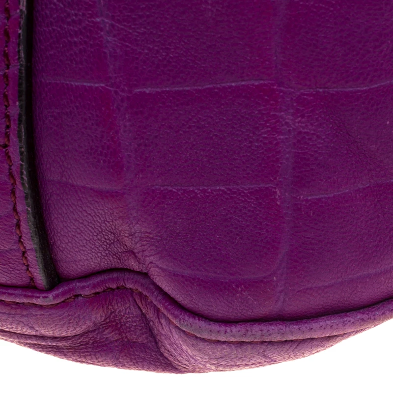 Fetch a classy look with this impeccable construction from the house of Mulberry. Crafted in exotic purple croc leather, the ‘Tillie’ satchel showcases a brilliant play of gold tone hardware. With a belted top handle and an adjustable shoulder strap, the bag opens to a suede lined interior that houses a flap and zip pocket to secure your belongings.