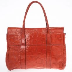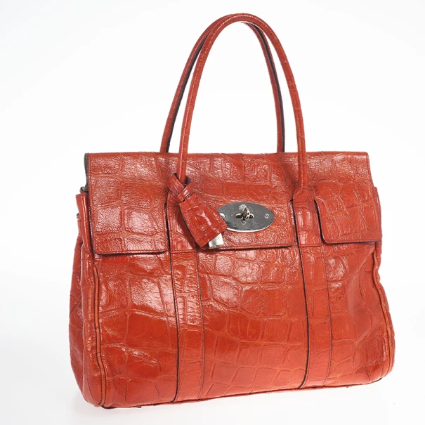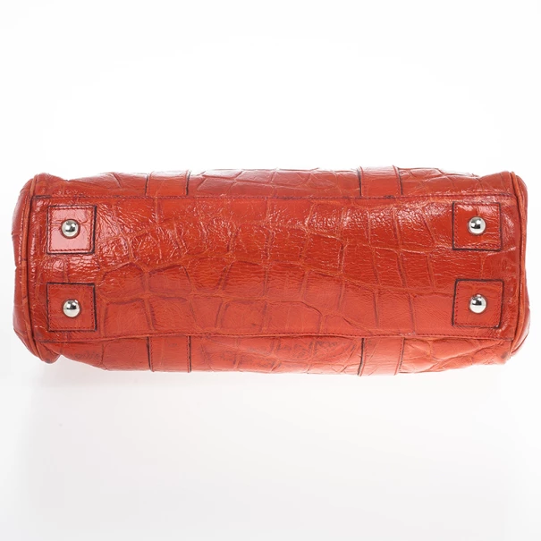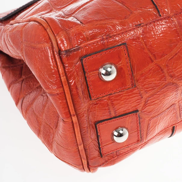Take your outfit a step further with this Mulberry purse. Its red crocodile embossed leather gives you a whole new look and a pop of color. The exterior is coupled with silver tone hardware and a flap closure with a padlock engraved with the Mulberry logo. The leather handles hold a removable lock with a hidden key for safe keeping. The interior is lined with suede and includes a pouch with two open pockets and one zipped.Original Retail Price: US $1,850