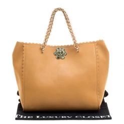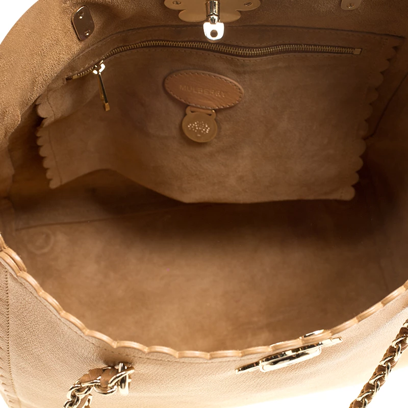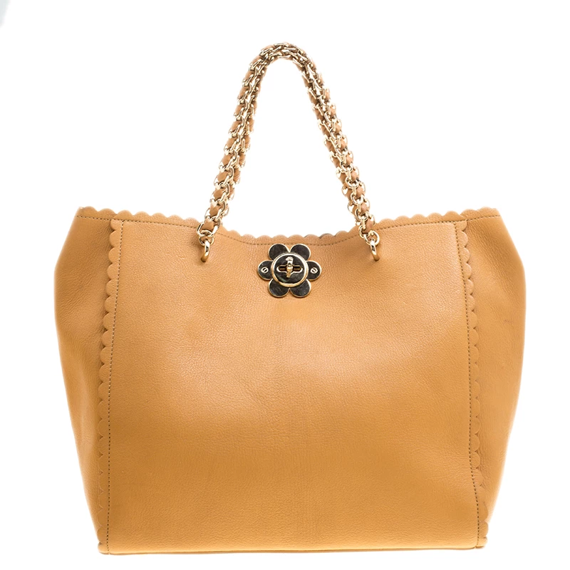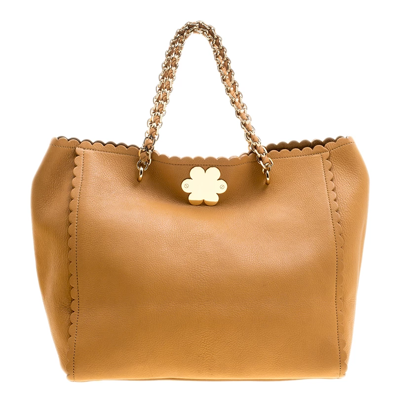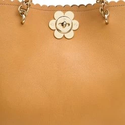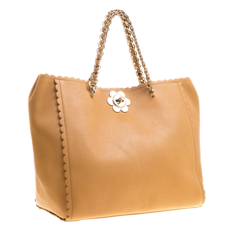 Mulberry’s Cecily tote represents the brand’s artistry of infusing innovation in simple designs. The bag is crafted with tan leather. It has a beautiful floral lock in gold-tone hardware with dual interwoven handles. Scalloped trims on the front and top border add a subtle feminine touch to the piece. The suede-lined interior is spacious and can hold all your everyday basics.