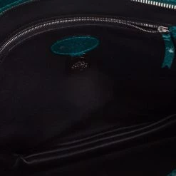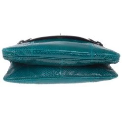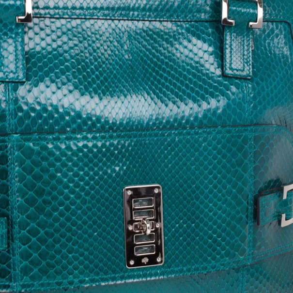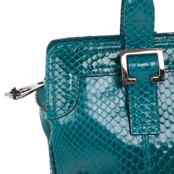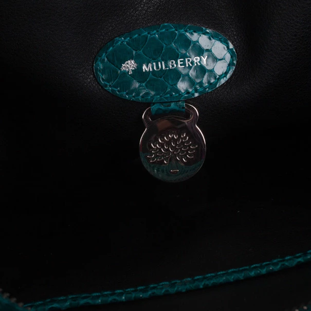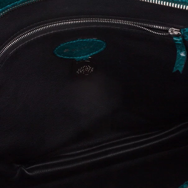 Give your everyday look a fun pop of color with this Mulberry tote. Its turqoise python leather exterior is coupled with gold-tone hardware and a structured design. This beauty features rolled double top handles and a frontal pocket with the signature Mulberry twist lock closure and side buckles. The zip-enclosed interior is leather lined and includes one patch pocket with a leather trim, and one zipped with the Mulberry charm.